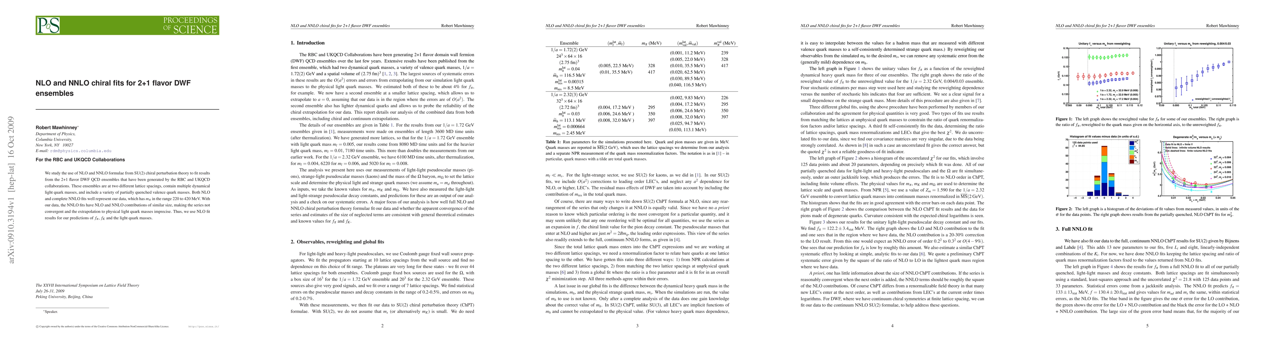 This paper investigates the application of NLO and NNLO chiral perturbation theory to fit data from 2+1 flavor Domain Wall Fermion ensembles, finding both fit levels adequately represent the data. The NNLO fits, however, yield non-convergent and imprecise results, leading to the use of NLO fit results for predictions of f_pi, f_K, and light quark masses.