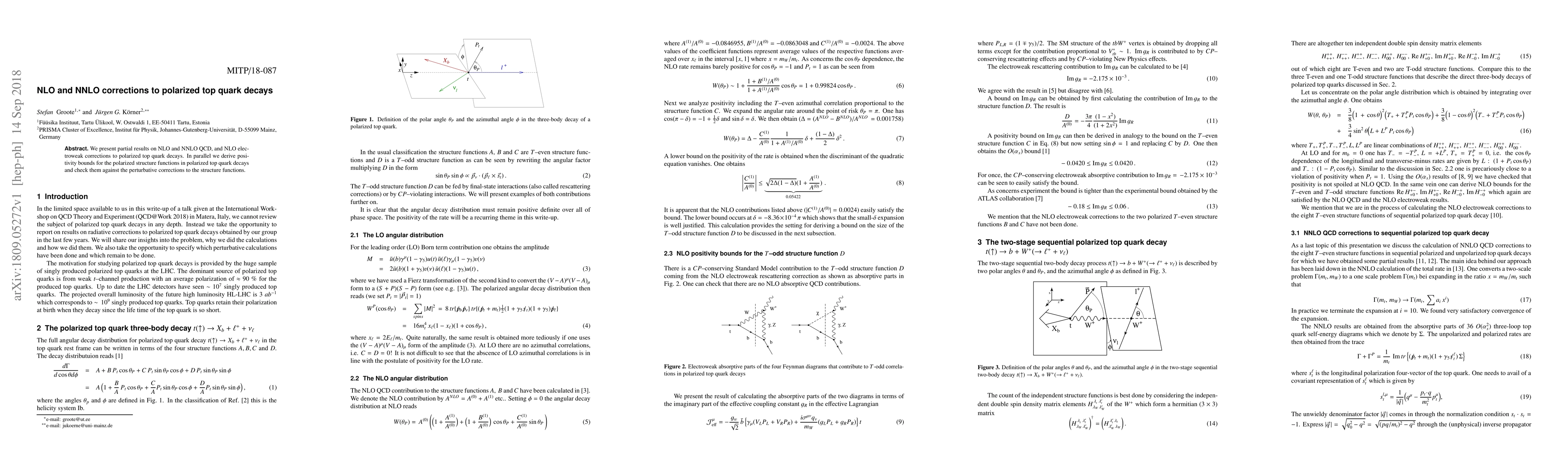 We present partial results on NLO and NNLO QCD, and NLO electroweak corrections to polarized top quark decays. In parallel we derive positivity bounds for the polarized structure functions in polarized top quark decays and check them against the perturbative corrections to the structure functions.