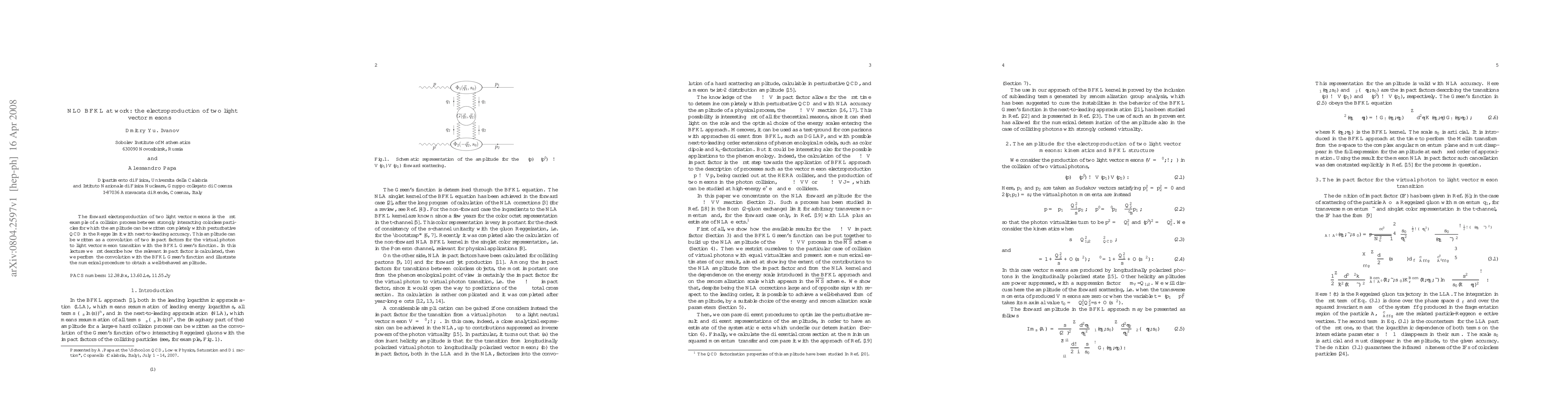 The forward electroproduction of two light vector mesons is the first example of a collision process between strongly interacting colorless particles for which the amplitude can be written completely within perturbative QCD in the Regge limit with next-to-leading accuracy. This amplitude can be written as a convolution of two impact factors for the virtual photon to light vector meson transition with the BFKL Green's function. In this lecture we first describe how the relevant impact factor is calculated, then we perform the convolution with the BFKL Green's function and illustrate the numerical procedure to obtain a well-behaved amplitude.