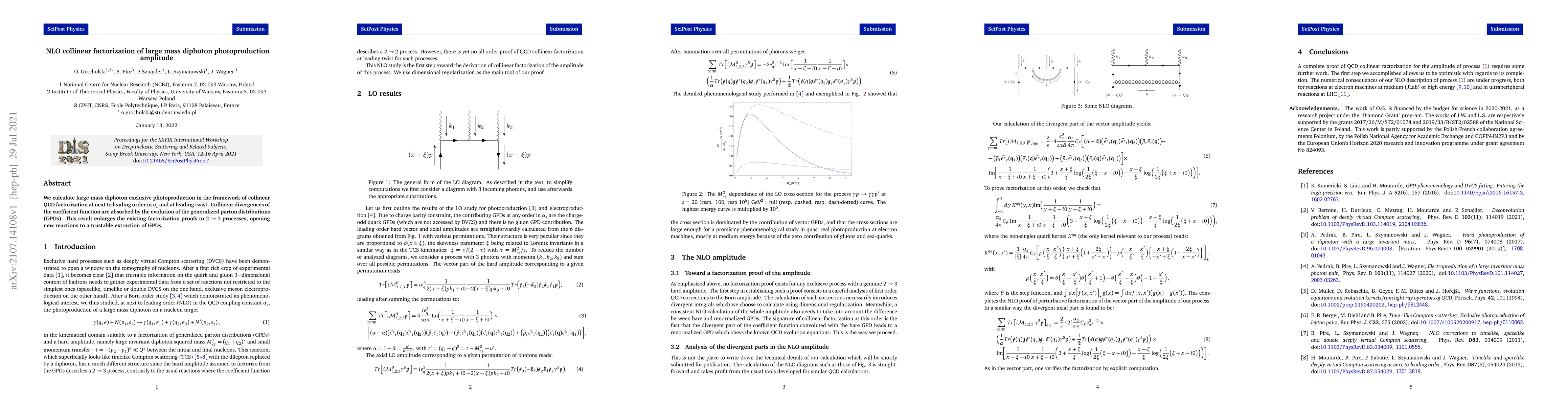 We calculate large mass diphoton exclusive photoproduction in the framework of collinear QCD factorization at next to leading order in {\alpha}s and at leading twist. Collinear divergences of the coefficient function are absorbed by the evolution of the generalized parton distributions (GPDs). This result enlarges the existing factorization proofs to 2 -> 3 processes, opening new reactions to a trustable extraction of GPDs.
