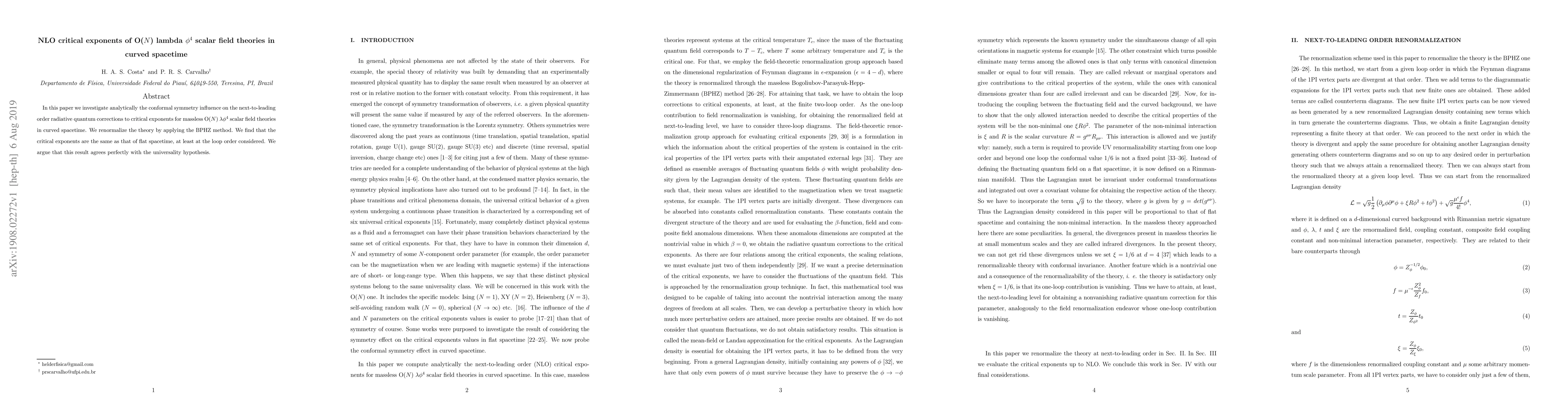 In this paper we investigate analytically the conformal symmetry influence on the next-to-leading order radiative quantum corrections to critical exponents for massless O($N$) $\lambda\phi^{4}$ scalar field theories in curved spacetime. We renormalize the theory by applying the BPHZ method. We find that the critical exponents are the same as that of flat spacetime, at least at the loop order considered. We argue that this result agrees perfectly with the universality hypothesis.