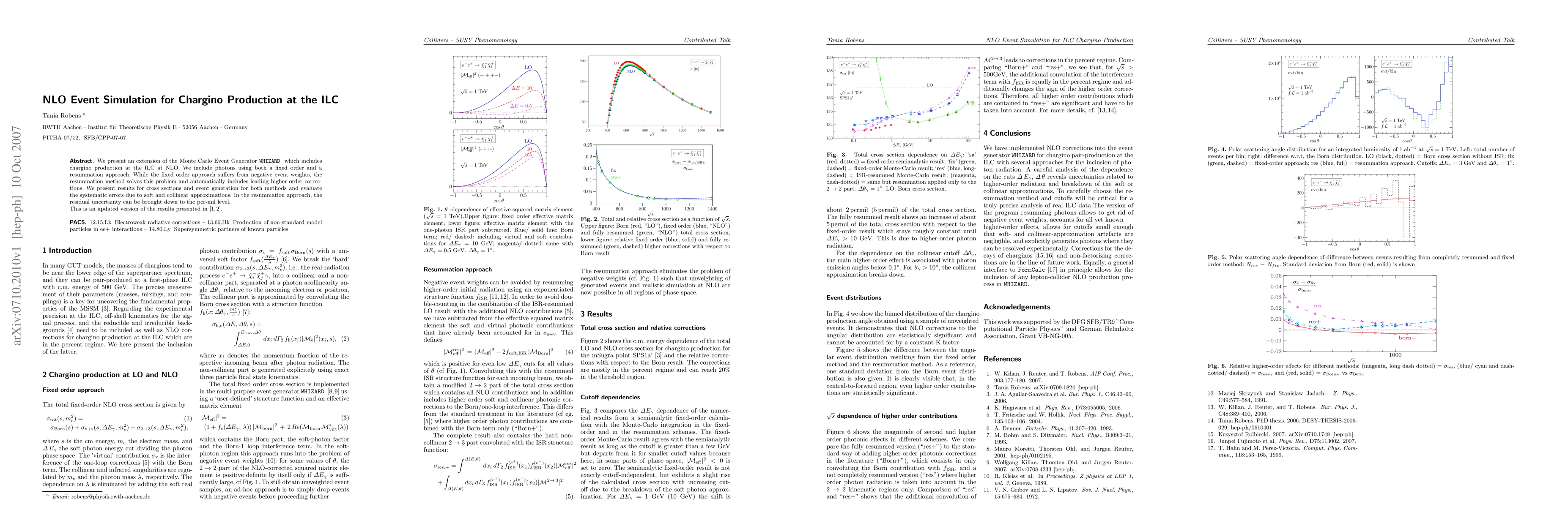 This paper extends the Monte Carlo Event Generator Whizard to simulate chargino production at the International Linear Collider (ILC) at next-to-leading order (NLO). It compares fixed-order and resummation methods for including photons, finding that the resummation approach effectively mitigates negative event weights and achieves higher accuracy, reducing residual uncertainty to the per-mil level.