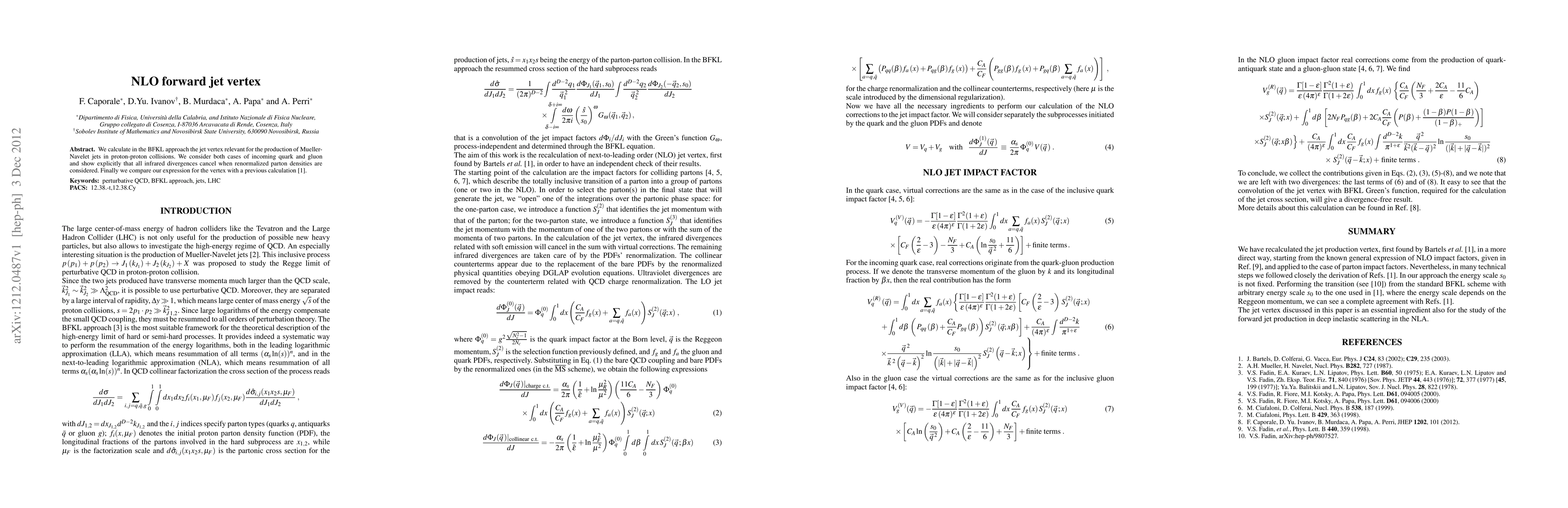 This paper calculates the jet vertex in the BFKL approach for Mueller-Navelet jet production in proton-proton collisions, considering both quark and gluon cases. It demonstrates that all infrared divergences cancel when using renormalized parton densities and compares the derived vertex expression with a previous calculation.