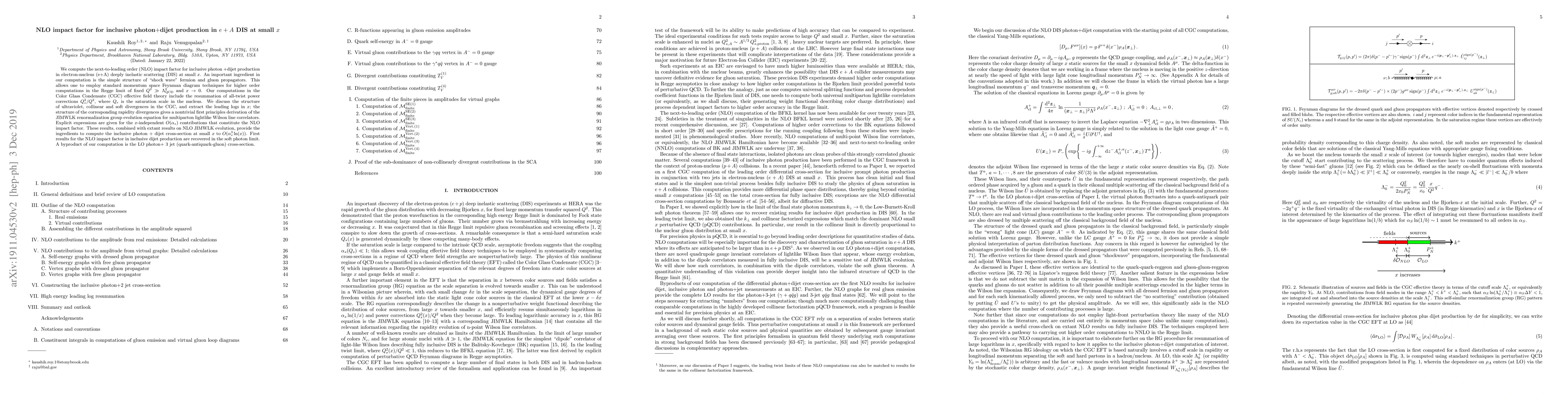 This paper computes the next-to-leading order (NLO) impact factor for inclusive photon + dijet production in electron-nucleus deep inelastic scattering at small $x$, employing the Color Glass Condensate effective field theory and resummation of power corrections. The study provides explicit expressions for the $O(\alpha_s)$ contributions and discusses the structure of divergences, leading to the derivation of the JIMWLK renormalization group equation.