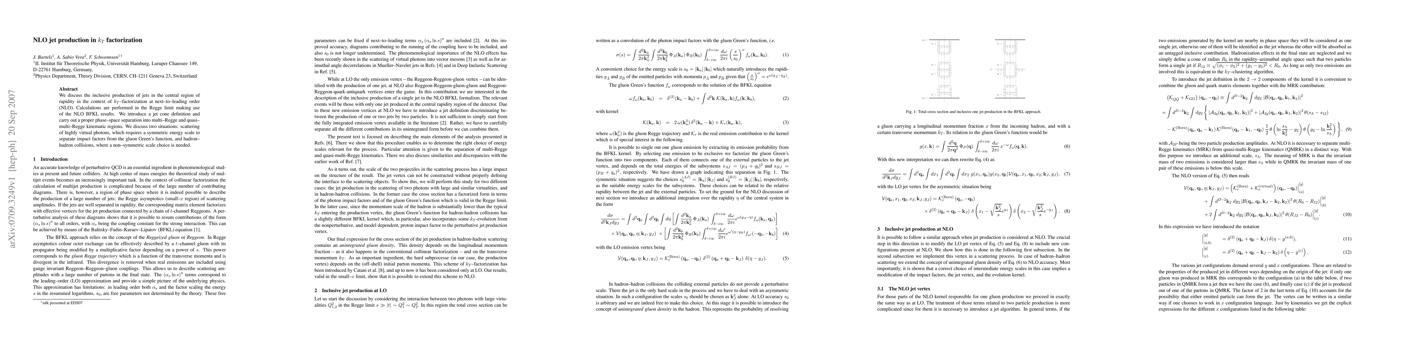 This paper investigates the inclusive production of jets in central rapidity using next-to-leading order (NLO) k_T factorization, employing NLO BFKL results in the Regge limit. It introduces a jet cone definition and separates phase space into multi-Regge and quasi-multi-Regge regions, addressing both photon scattering and hadron-hadron collisions with appropriate scale choices.