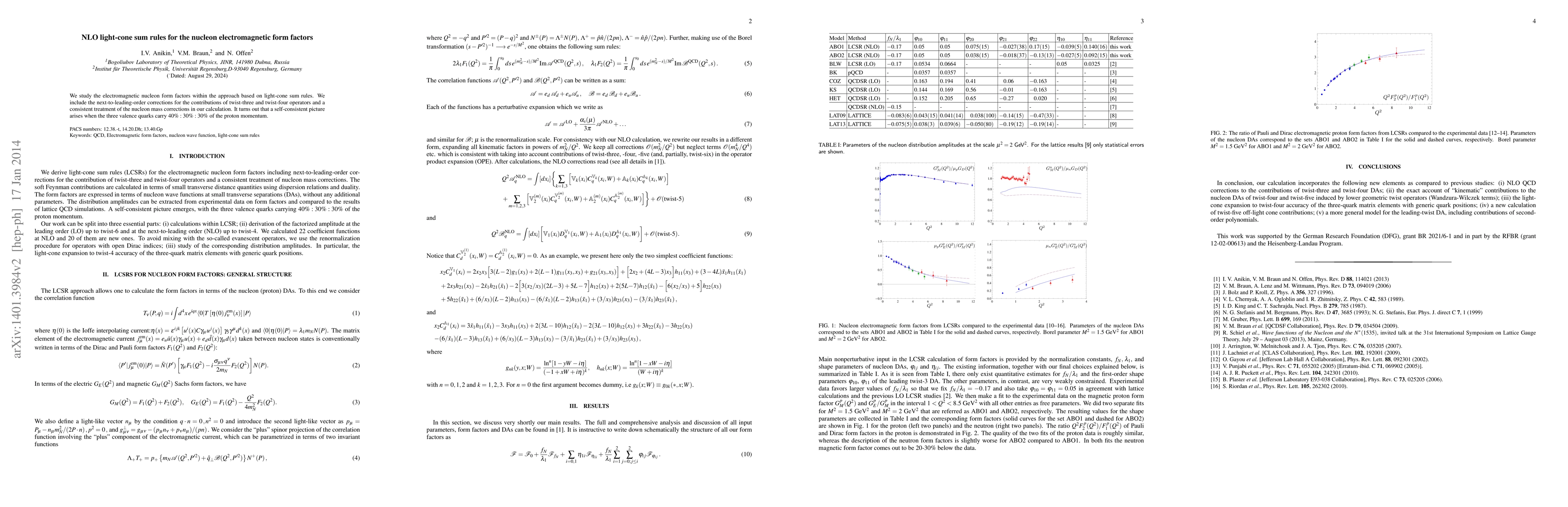This paper investigates nucleon electromagnetic form factors using next-to-leading-order light-cone sum rules, incorporating twist-three and twist-four operator contributions and nucleon mass corrections. The analysis reveals that the three valence quarks share the proton's momentum in a ratio of 40:30:30.