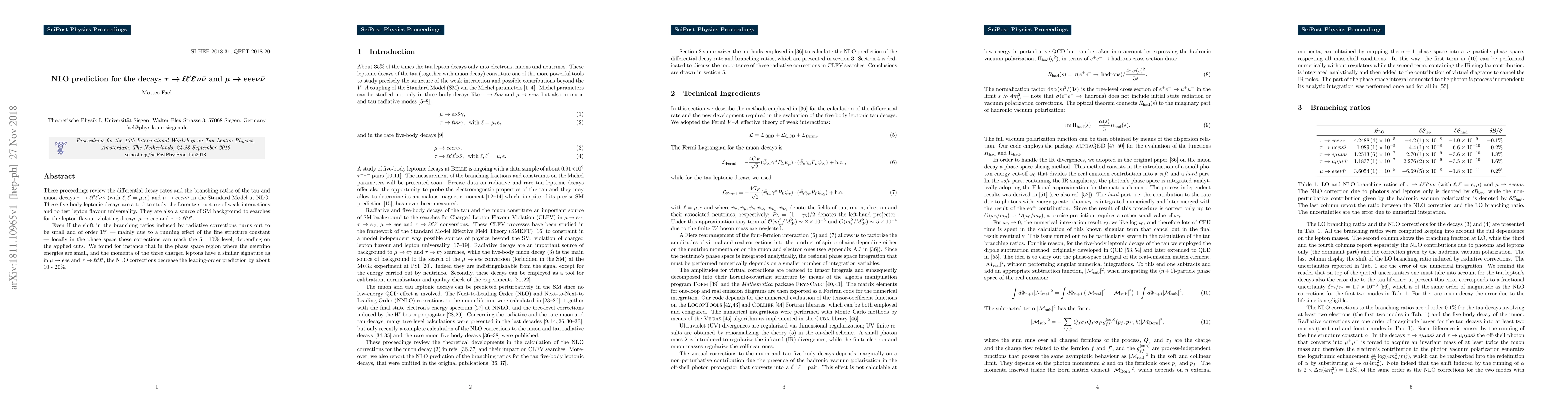 This paper reviews the Standard Model predictions at next-to-leading order (NLO) for the decays $\tau \to \ell \ell'\ell' \nu \bar \nu$ and $\mu \to e e e \nu \bar \nu$, focusing on differential decay rates and branching ratios. It highlights that while NLO corrections are generally small, they can locally reach 5-10% in specific phase space regions, significantly reducing the leading-order predictions by 10-20% in certain configurations.
