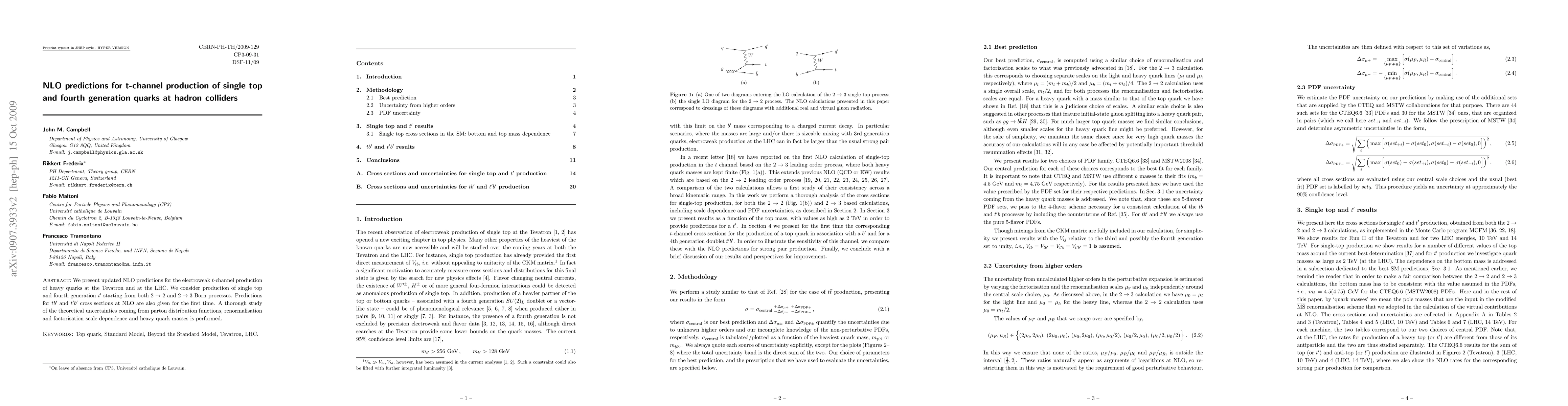 We present updated NLO predictions for the electroweak t-channel production of heavy quarks at the Tevatron and at the LHC. We consider production of single top and fourth generation t' starting from both 2 to 2 and 2 to 3 Born processes. Predictions for tb' and t'b' cross sections at NLO are also given for the first time. A thorough study of the theoretical uncertainties coming from parton distribution functions, renormalisation and factorisation scale dependence and heavy quark masses is performed.