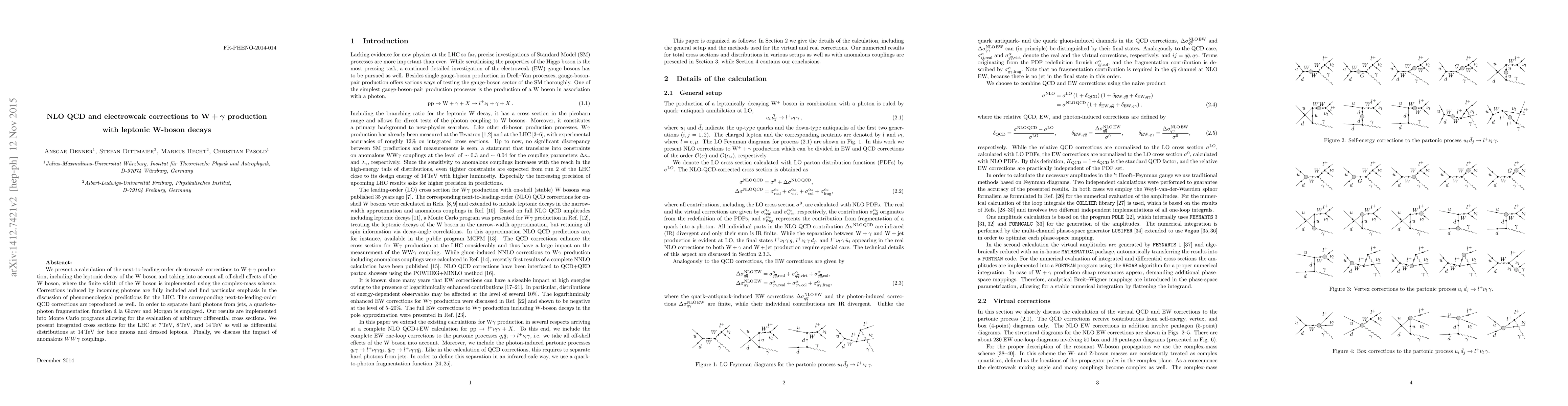 This paper calculates next-to-leading-order electroweak and QCD corrections for W+γ production, focusing on the leptonic decay of the W boson and employing the complex-mass scheme for off-shell effects. Results are implemented in Monte Carlo programs for differential cross sections and integrated cross sections at various LHC energies, with a discussion on anomalous WWγ couplings.
