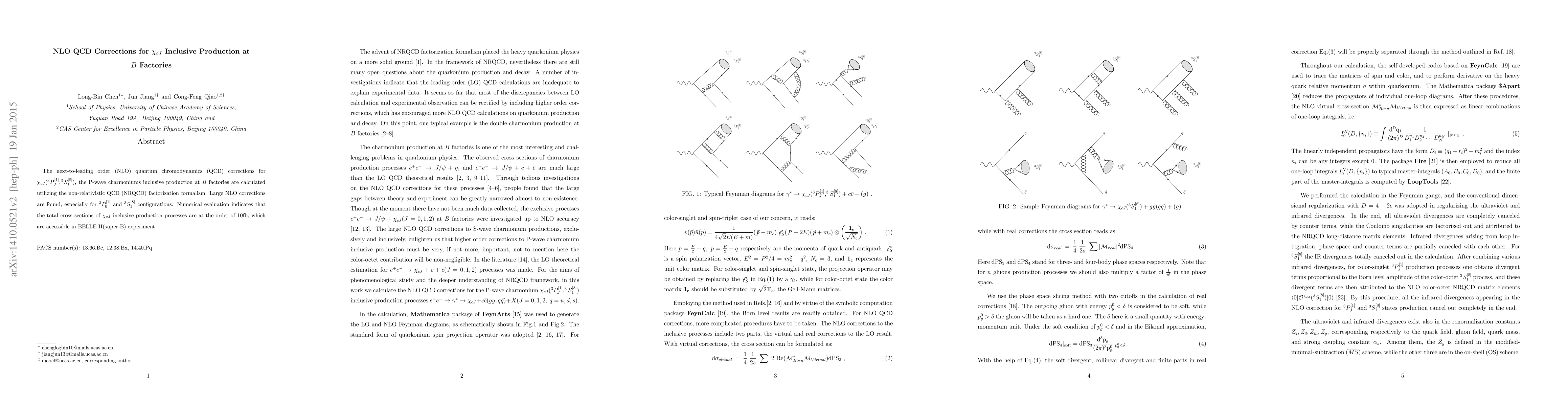 The next-to-leading order (NLO) quantum chromodynamics (QCD) corrections for $\chi_{cJ}(^3P_J^{[1]},^3S_1^{[8]})$, the P-wave charmoniums inclusive production at $B$ factories are calculated utilizing the non-relativistic QCD (NRQCD) factorization formalism. Large NLO corrections are found, especially for $^3P_0^{[1]}$ and $^3S_1^{[8]}$ configurations. Numerical evaluation indicates that the total cross sections of $\chi_{cJ}$ inclusive production processes are at the order of $10$fb, which are accessible in BELLE II(super-B) experiment.