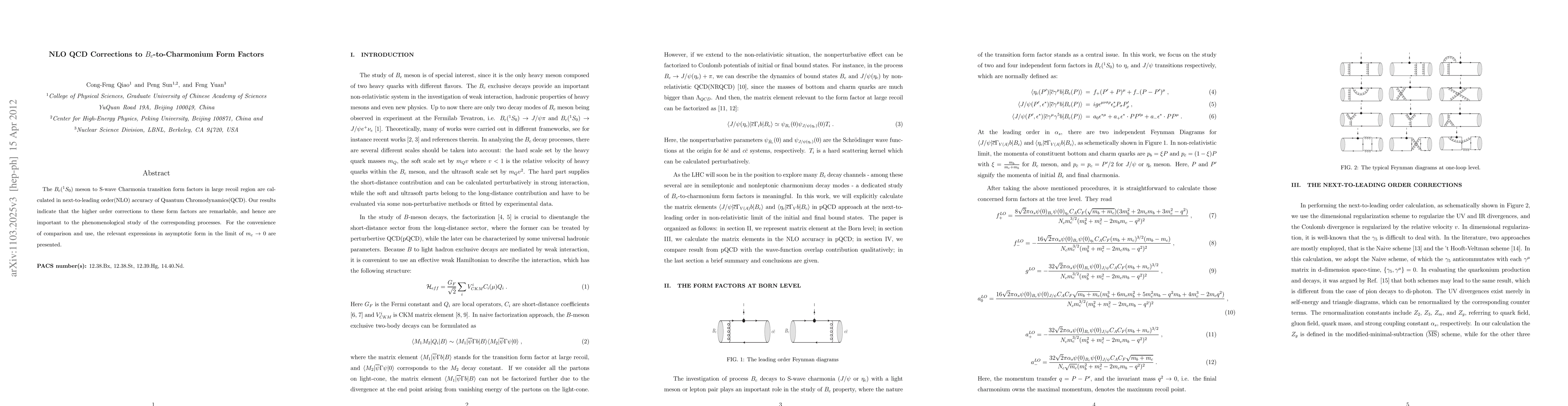 The $B_c(^1S_0)$ meson to S-wave Charmonia transition form factors are calculated in next-to-leading order(NLO) accuracy of Quantum Chromodynamics(QCD). Our results indicate that the higher order corrections to these form factors are remarkable, and hence are important to the phenomenological study of the corresponding processes. For the convenience of comparison and use, the relevant expressions in asymptotic form at the limit of $m_c\rightarrow0$ for the radiative corrections are presented.