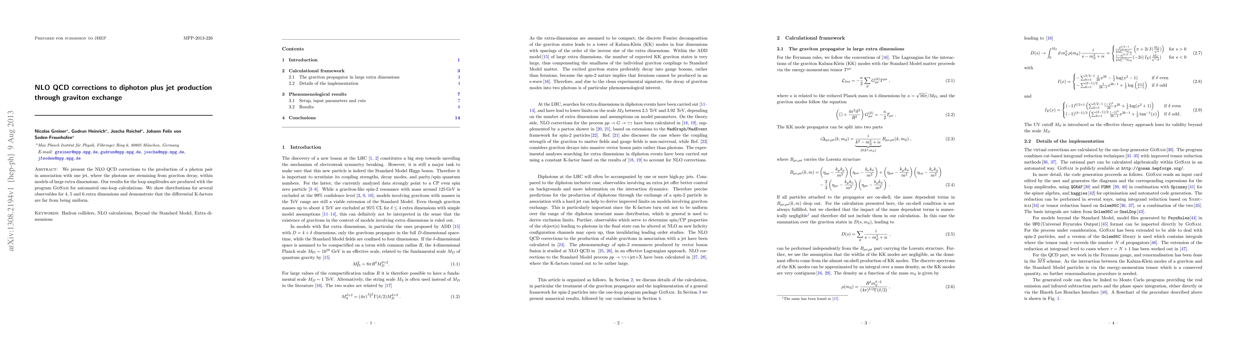 We present the NLO QCD corrections to the production of a photon pair in association with one jet, where the photons are stemming from graviton decay, within models of large extra dimensions. Our results for the loop amplitudes are produced with the program GOSAM for automated one-loop calculations. We show distributions for several observables for 4, 5 and 6 extra dimensions and demonstrate that the differential K-factors are far from being uniform.
