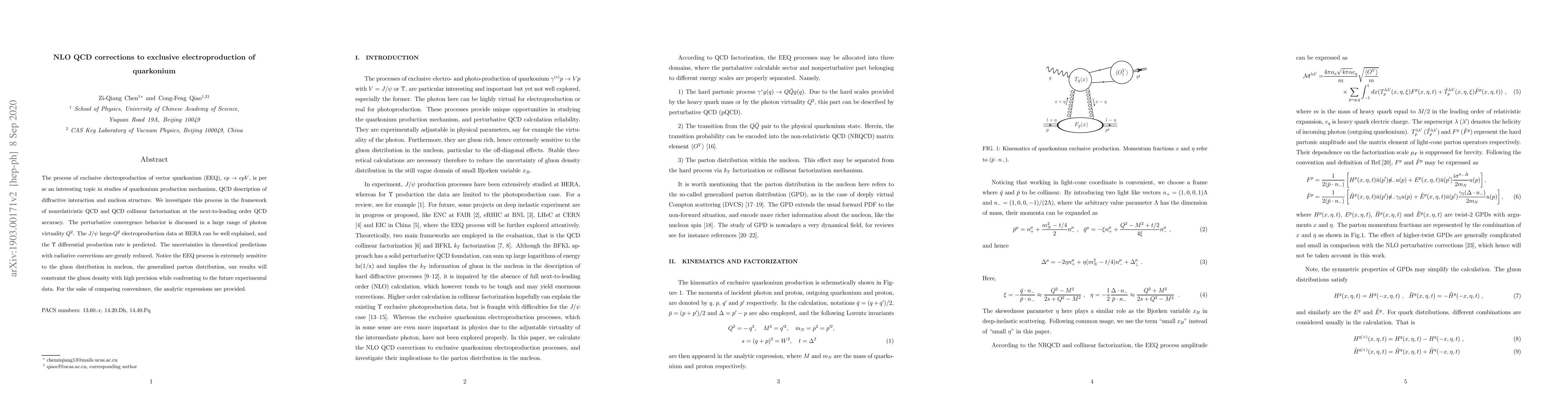 This paper investigates the exclusive electroproduction of vector quarkonium at next-to-leading order QCD accuracy, providing improved predictions for $J/\psi$ and $\Upsilon$ production rates and constraining the gluon density in nucleons with high precision. The study also reduces uncertainties in theoretical predictions through radiative corrections.