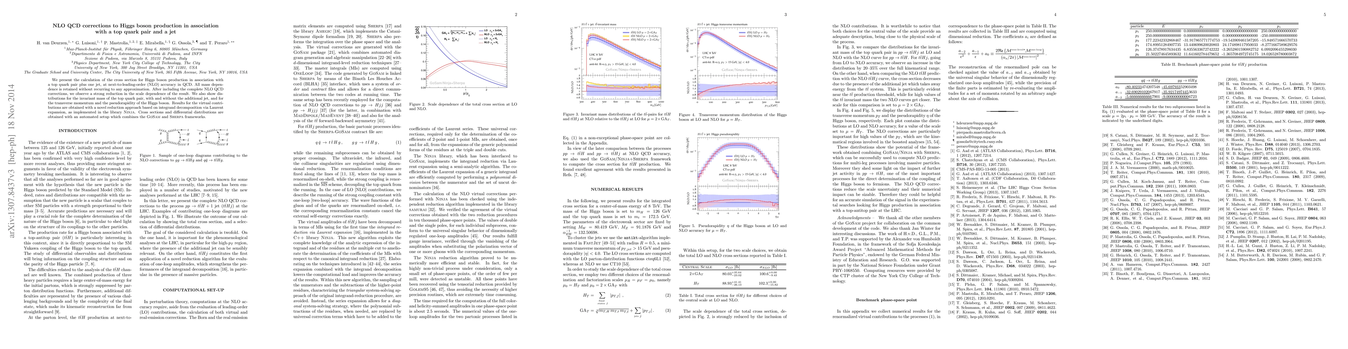 We present the calculation of the cross section for Higgs boson production in association with a top quark pair plus one jet, at next-to-leading-order (NLO) accuracy in QCD. All mass dependence is retained without recurring to any approximation. After including the complete NLO QCD corrections, we observe a strong reduction in the scale dependence of the result. We also show distributions for the invariant mass of the top quark pair, with and without the additional jet, and for the transverse momentum and the pseudorapidity of the Higgs boson. Results for the virtual contributions are obtained with a novel reduction approach based on integrand decomposition via Laurent expansion, as implemented in the library Ninja. Cross sections and differential distributions are obtained with an automated setup which combines the GoSam and Sherpa frameworks.
