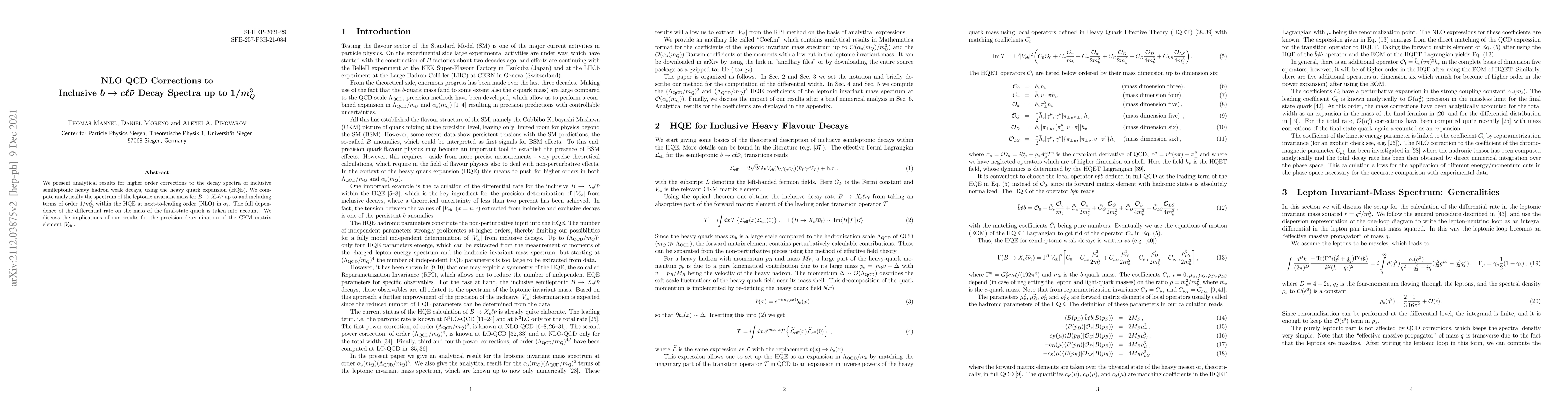 We present analytical results for higher order corrections to the decay spectra of inclusive semileptonic heavy hadron weak decays using the heavy quark expansion (HQE). We compute analytically the spectrum of the leptonic invariant mass for $B \rightarrow X_c \ell \bar{\nu}$ up to and including terms of order $1/m_Q^3$ within the HQE at next-to-leading order (NLO) in $\alpha_s$. The full dependence of the differential rate on the mass of the final-state quark is taken into account. We discuss the implications of our results for the precision determination of the CKM matrix element $|V_{cb}|$.