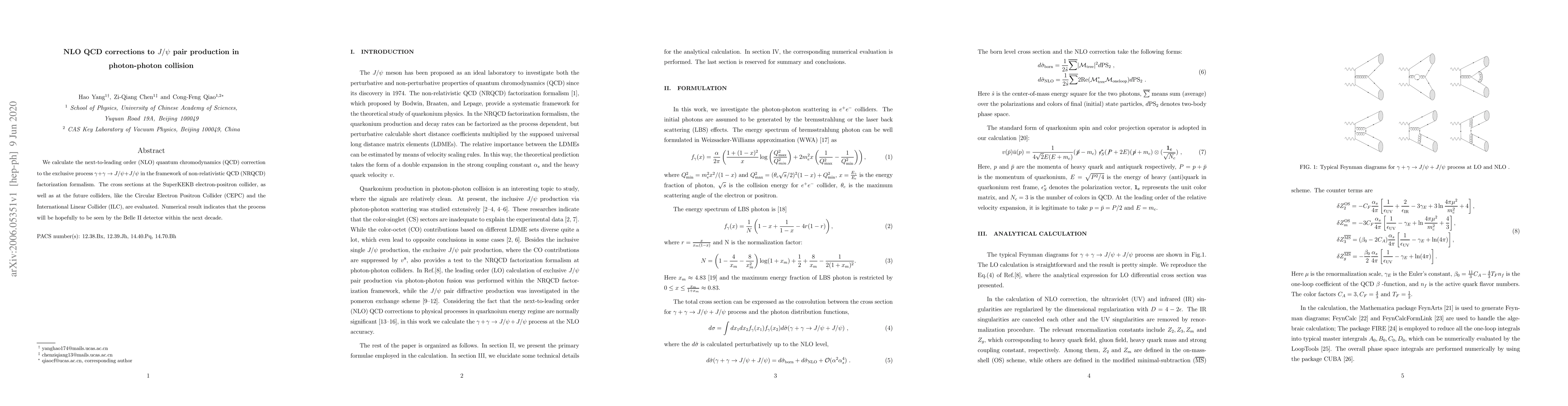 The paper presents a detailed calculation of NLO QCD corrections to the γ+γ→J/ψ+J/ψ process using NRQCD factorization, including analytical and numerical methods for handling Feynman diagrams, integrals, and phase space.