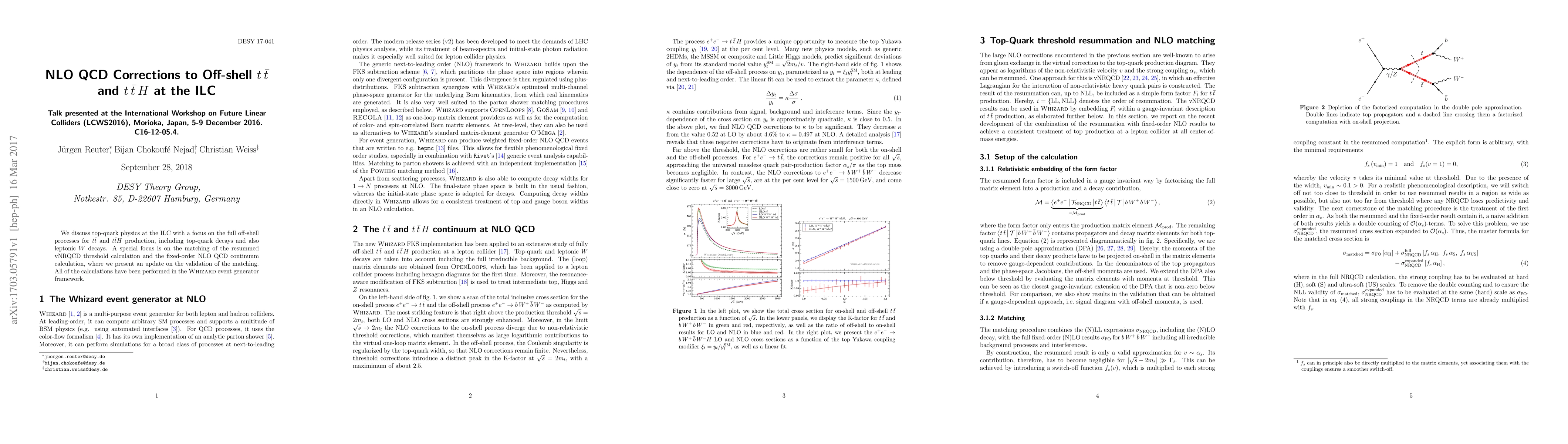This paper investigates full off-shell top-quark pair processes ($t\bar{t}$ and $t\bar{t}H$) at the ILC, emphasizing the integration of resummed vNRQCD and fixed-order NLO QCD calculations, validated within the \wz event generator framework. The study also includes top-quark decays and leptonic $W$ decays.