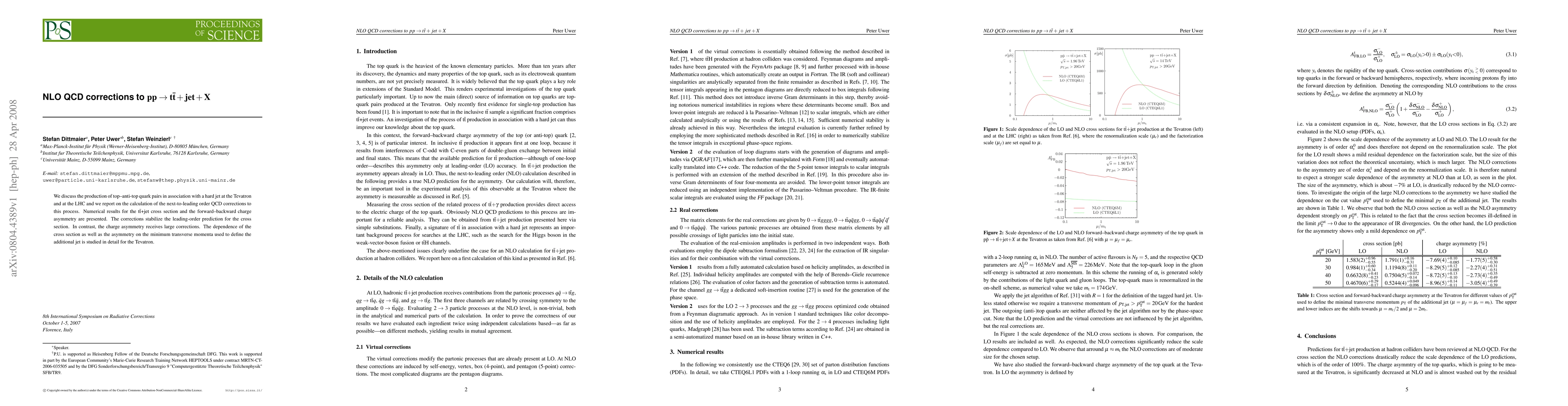 We discuss the production of top--anti-top quark pairs in association with a hard jet at the Tevatron and at the LHC and we report on the calculation of the next-to-leading order QCD corrections to this process. Numerical results for the top--anti-top+jet cross section and the forward--backward charge asymmetry are presented. The corrections stabilize the leading-order prediction for the cross section. In contrast, the charge asymmetry receives large corrections. The dependence of the cross section as well as the asymmetry on the minimum transverse momenta used to define the additional jet is studied in detail for the Tevatron.