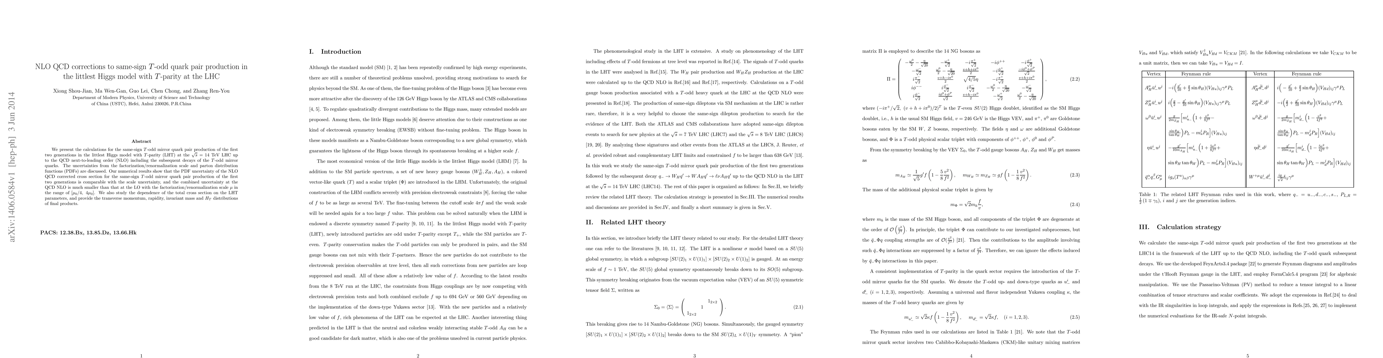 We present the calculations for the same-sign $T$-odd mirror quark pair production of the first two generations in the littlest Higgs model with $T$-parity (LHT) at the $\sqrt{s}=14~{\rm TeV}$ LHC up to the QCD next-to-leading order (NLO) including the subsequent decays of the $T$-odd mirror quarks. The uncertainties from the factorization/renormalization scale and parton distribution functions (PDFs) are discussed. Our numerical results show that the PDF uncertainty of the NLO QCD corrected cross section for the same-sign $T$-odd mirror quark pair production of the first two generations is comparable with the scale uncertainty, and the combined uncertainty at the QCD NLO is much smaller than that at the LO with the factorization/renormalization scale $\mu$ in the range of $[\mu_0/4,~4\mu_0]$. We also study the dependence of the total cross section on the LHT parameters, and provide the transverse momentum, rapidity, invariant mass and $H_T$ distributions of final products.