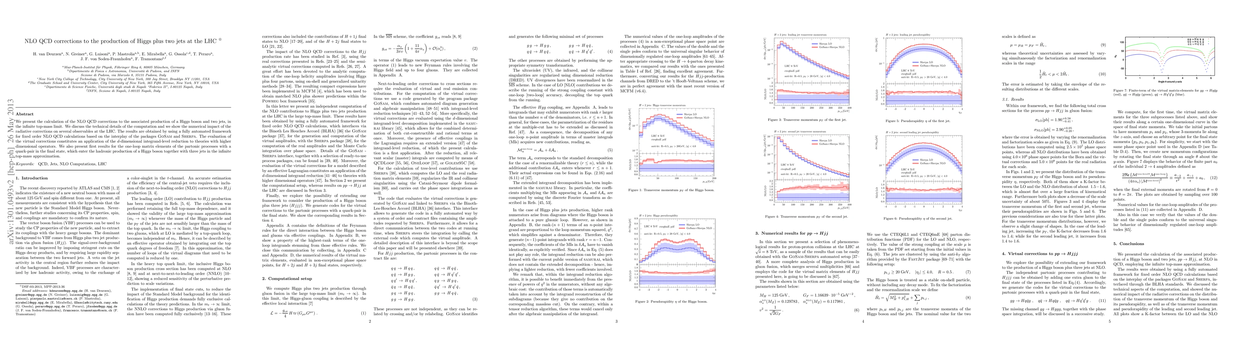 This paper calculates the next-to-leading order (NLO) QCD corrections for the production of a Higgs boson accompanied by two jets at the LHC, employing a fully automated framework combining GoSam and Sherpa. The study highlights the significant impact of these corrections on various observables and presents initial results for related one-loop matrix elements involving quark pairs.