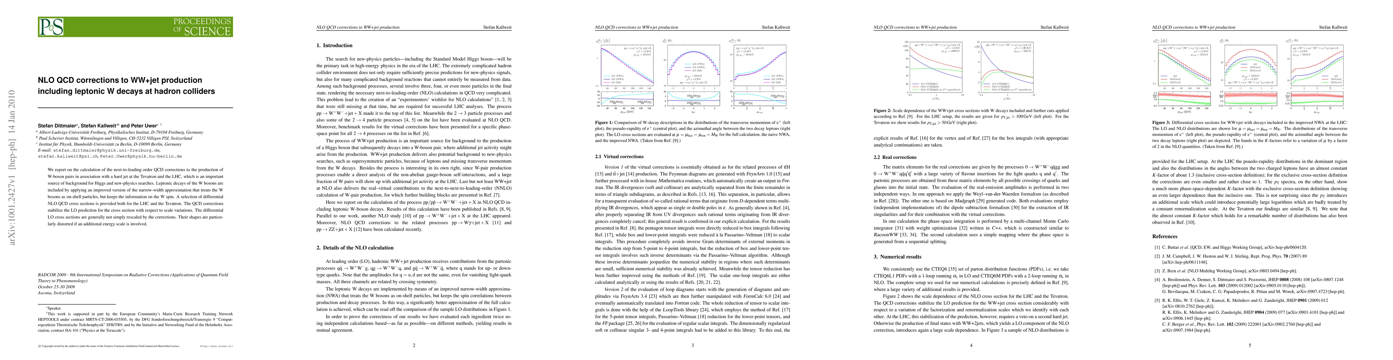 This paper calculates next-to-leading order QCD corrections for WW+jet production at the Tevatron and LHC, including leptonic W-boson decays, which is crucial for Higgs and new-physics searches. The improved narrow-width approximation stabilizes the LO cross-section predictions and alters the shape of differential cross sections, especially when additional energy scales are considered.
