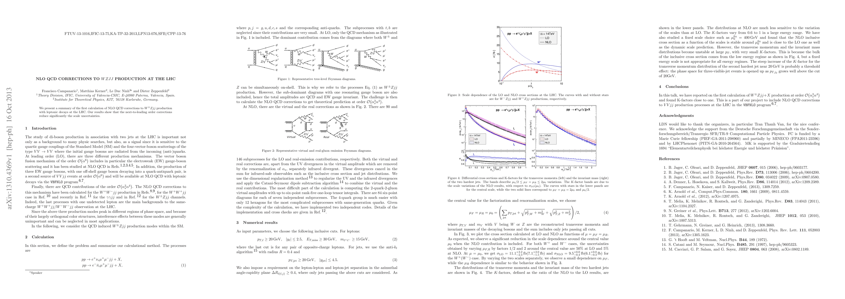 Summary: This study reports the first NLO QCD corrections for WZjj production with leptonic decays at the LHC, demonstrating that these corrections significantly reduce scale uncertainties.
