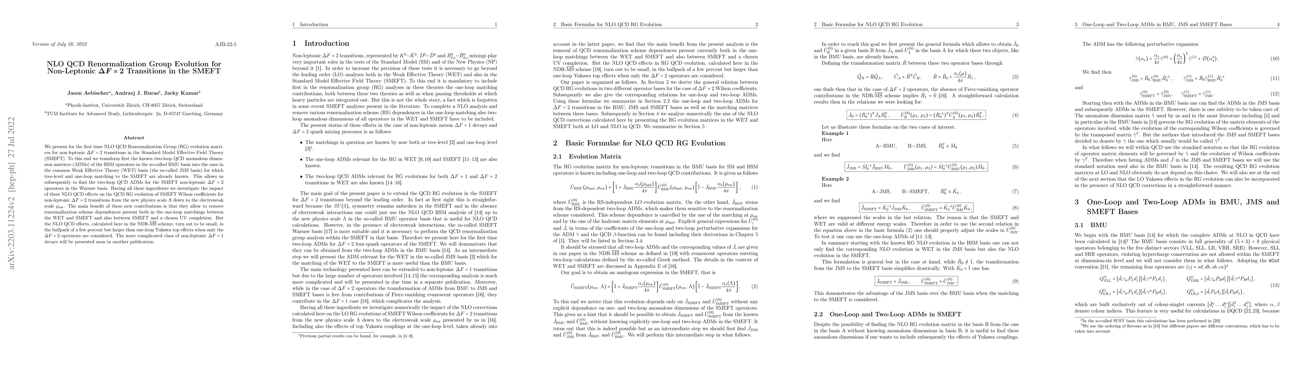 This paper presents the first NLO QCD Renormalization Group evolution matrices for non-leptonic $\Delta F=2$ transitions in the SMEFT, transforming two-loop QCD ADMs from the BMU to the JMS basis. The study finds that these NLO QCD effects, while small (around a few percent), are significant compared to one-loop Yukawa top effects and help reduce scheme dependences in matching processes.