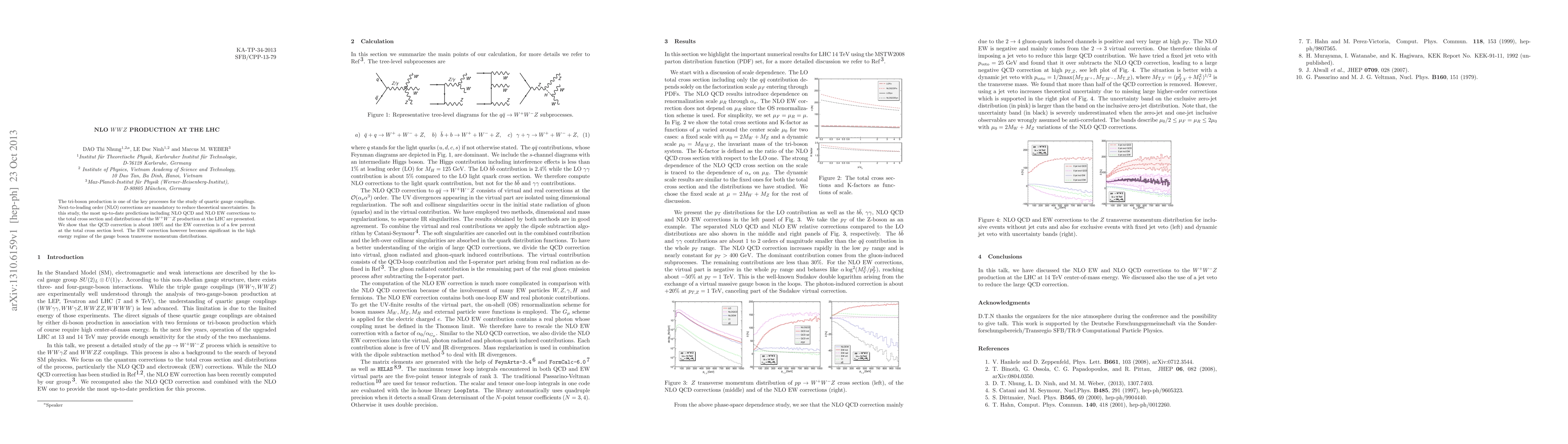 The tri-boson production is one of the key processes for the study of quartic gauge couplings. Next-to-leading order (NLO) corrections are mandatory to reduce theoretical uncertainties. In this study, the most up-to-date predictions including NLO QCD and NLO EW corrections to the total cross section and distributions of the WWZ production at the LHC are presented. We show that the QCD correction is about 100% and the EW correction is of a few percent at the total cross section level. The EW correction however becomes significant in the high energy regime of the gauge boson transverse momentum distributions.