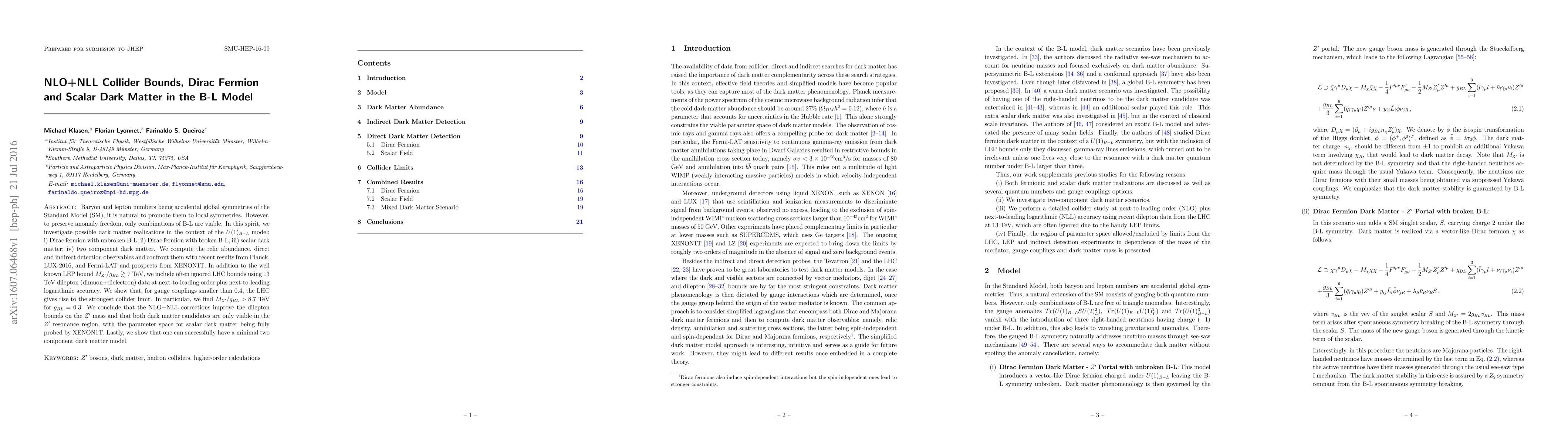 This paper explores dark matter candidates within the $U(1)_{B-L}$ model, including Dirac fermions and scalar dark matter, and evaluates their relic abundance and detection prospects. It finds that NLO+NLL corrections significantly enhance collider bounds on the $Z^{\prime}$ mass, with the LHC providing the strongest limit for small gauge couplings, and concludes that the parameter space for scalar dark matter is fully probed by XENON1T.