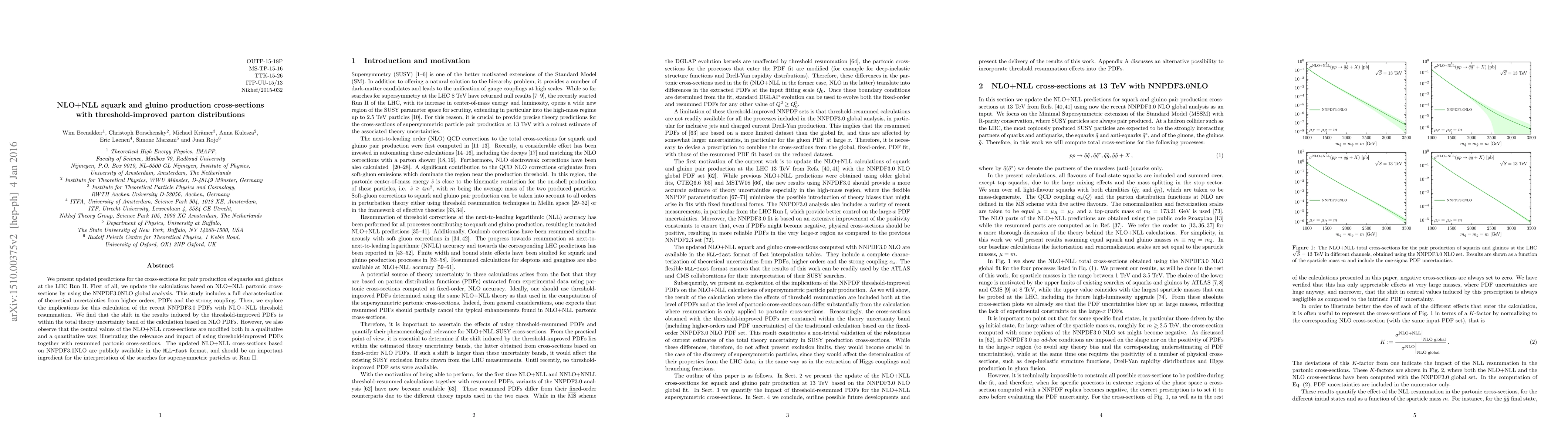 This paper updates predictions for squark and gluino pair production cross-sections at the LHC using NLO+NLL partonic cross-sections and NNPDF3.0NLO PDFs, showing that threshold-improved PDFs modify central cross-section values within the total theoretical uncertainty. The results are publicly available and crucial for interpreting searches for supersymmetric particles.