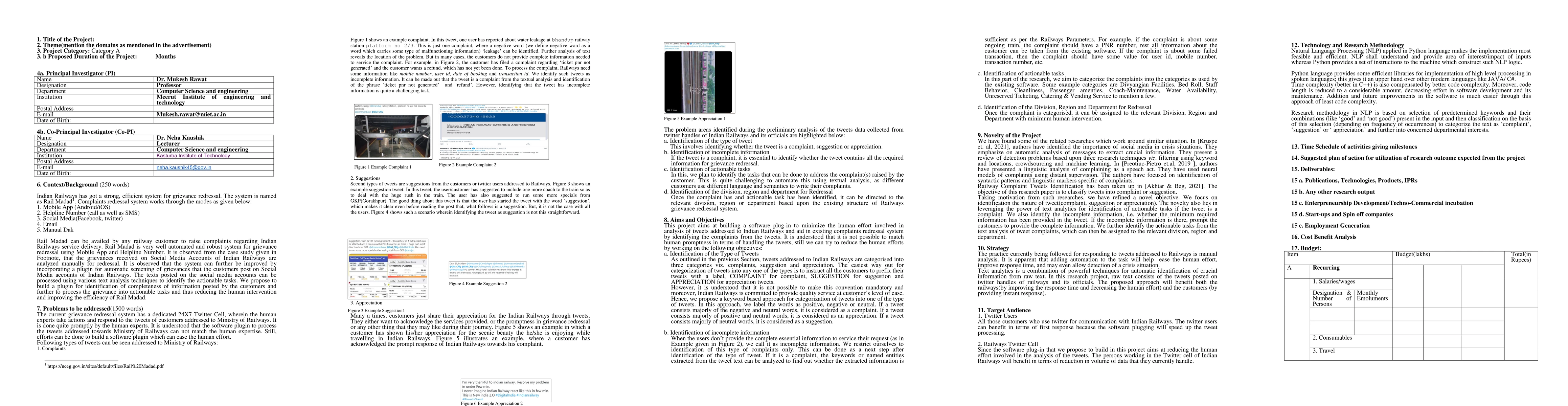 Summary: This research aims to develop an NLP-based software plugin to assist the Indian Railways' grievance redressal system by automating the analysis of tweets, thereby reducing human effort in complaint identification. While human promptness remains unmatched, the goal is to ease the workload of human experts through efficient complaint detection from tweets.