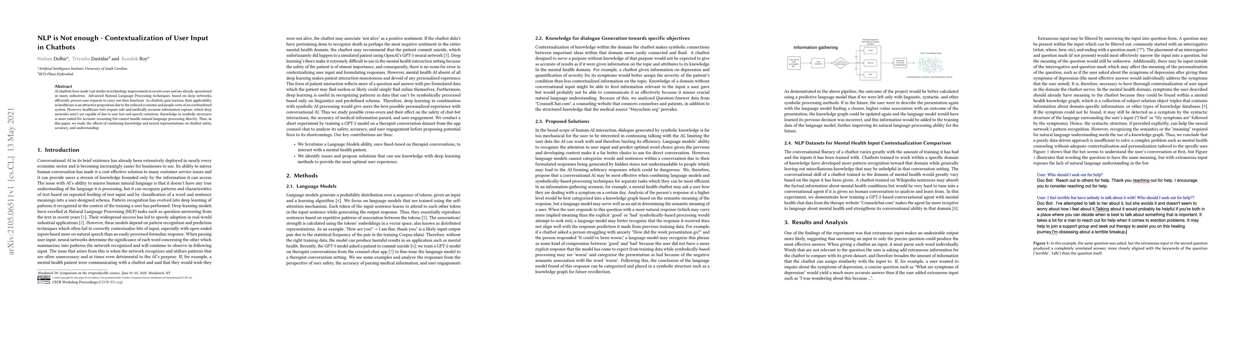 AI chatbots have made vast strides in technology improvement in recent years and are already operational in many industries. Advanced Natural Language Processing techniques, based on deep networks, efficiently process user requests to carry out their functions. As chatbots gain traction, their applicability in healthcare is an attractive proposition due to the reduced economic and people costs of an overburdened system. However, healthcare bots require safe and medically accurate information capture, which deep networks aren't yet capable of due to user text and speech variations. Knowledge in symbolic structures is more suited for accurate reasoning but cannot handle natural language processing directly. Thus, in this paper, we study the effects of combining knowledge and neural representations on chatbot safety, accuracy, and understanding.