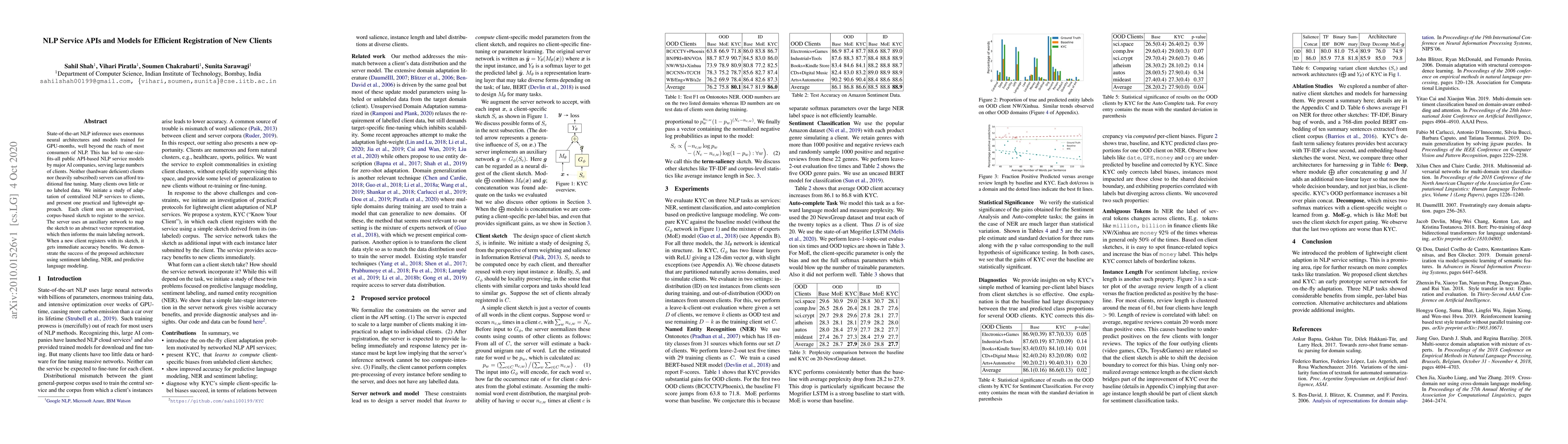 State-of-the-art NLP inference uses enormous neural architectures and models trained for GPU-months, well beyond the reach of most consumers of NLP. This has led to one-size-fits-all public API-based NLP service models by major AI companies, serving large numbers of clients. Neither (hardware deficient) clients nor (heavily subscribed) servers can afford traditional fine tuning. Many clients own little or no labeled data. We initiate a study of adaptation of centralized NLP services to clients, and present one practical and lightweight approach. Each client uses an unsupervised, corpus-based sketch to register to the service. The server uses an auxiliary network to map the sketch to an abstract vector representation, which then informs the main labeling network. When a new client registers with its sketch, it gets immediate accuracy benefits. We demonstrate the success of the proposed architecture using sentiment labeling, NER, and predictive language modeling