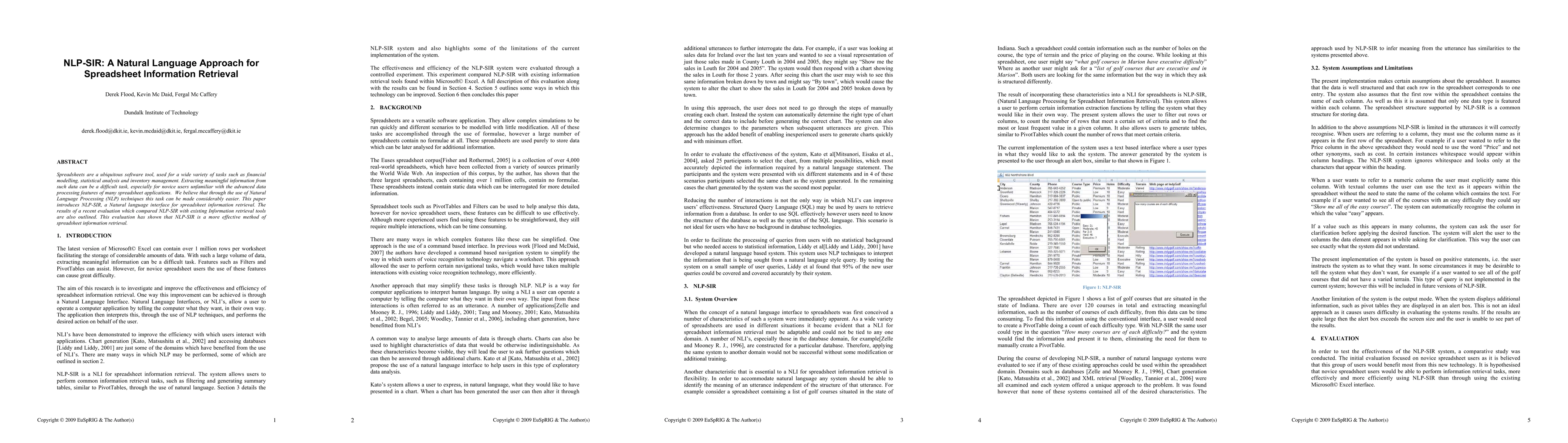 This paper introduces NLP-SIR, a Natural Language Processing (NLP)-based interface for retrieving information from spreadsheets, aiming to simplify the process for novice users. Evaluation results indicate that NLP-SIR outperforms existing information retrieval tools in spreadsheet data retrieval.