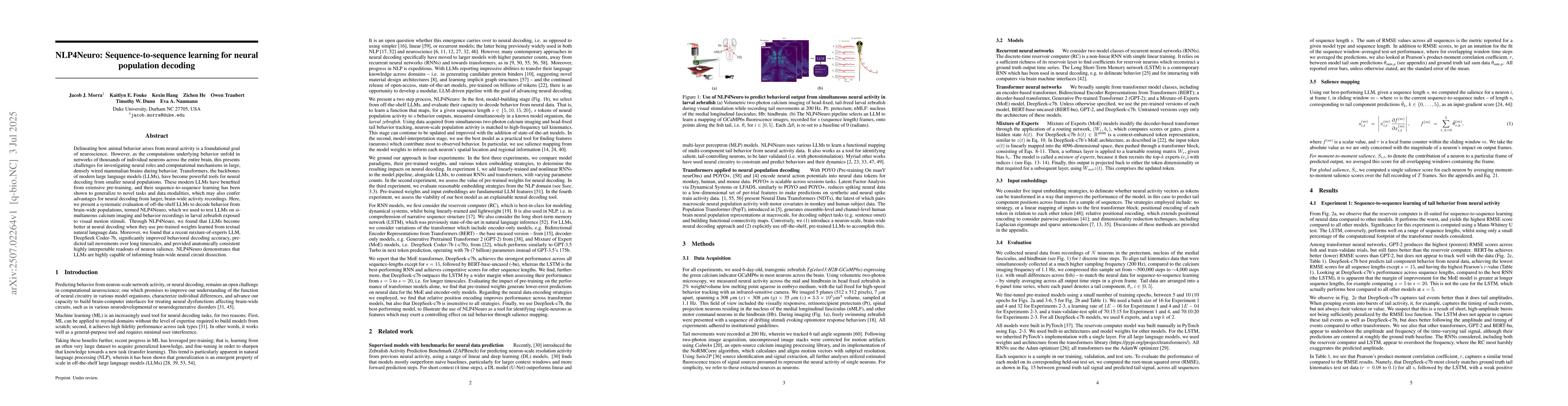 Delineating how animal behavior arises from neural activity is a foundational goal of neuroscience. However, as the computations underlying behavior unfold in networks of thousands of individual neurons across the entire brain, this presents challenges for investigating neural roles and computational mechanisms in large, densely wired mammalian brains during behavior. Transformers, the backbones of modern large language models (LLMs), have become powerful tools for neural decoding from smaller neural populations. These modern LLMs have benefited from extensive pre-training, and their sequence-to-sequence learning has been shown to generalize to novel tasks and data modalities, which may also confer advantages for neural decoding from larger, brain-wide activity recordings. Here, we present a systematic evaluation of off-the-shelf LLMs to decode behavior from brain-wide populations, termed NLP4Neuro, which we used to test LLMs on simultaneous calcium imaging and behavior recordings in larval zebrafish exposed to visual motion stimuli. Through NLP4Neuro, we found that LLMs become better at neural decoding when they use pre-trained weights learned from textual natural language data. Moreover, we found that a recent mixture-of-experts LLM, DeepSeek Coder-7b, significantly improved behavioral decoding accuracy, predicted tail movements over long timescales, and provided anatomically consistent highly interpretable readouts of neuron salience. NLP4Neuro demonstrates that LLMs are highly capable of informing brain-wide neural circuit dissection.