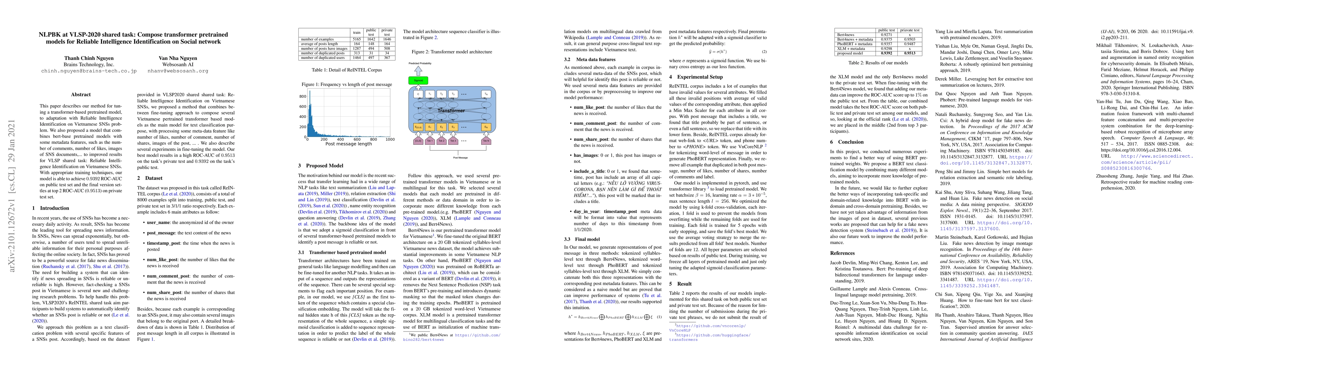 This paper describes our method for tuning a transformer-based pretrained model, to adaptation with Reliable Intelligence Identification on Vietnamese SNSs problem. We also proposed a model that combines bert-base pretrained models with some metadata features, such as the number of comments, number of likes, images of SNS documents,... to improved results for VLSP shared task: Reliable Intelligence Identification on Vietnamese SNSs. With appropriate training techniques, our model is able to achieve 0.9392 ROC-AUC on public test set and the final version settles at top 2 ROC-AUC (0.9513) on private test set.