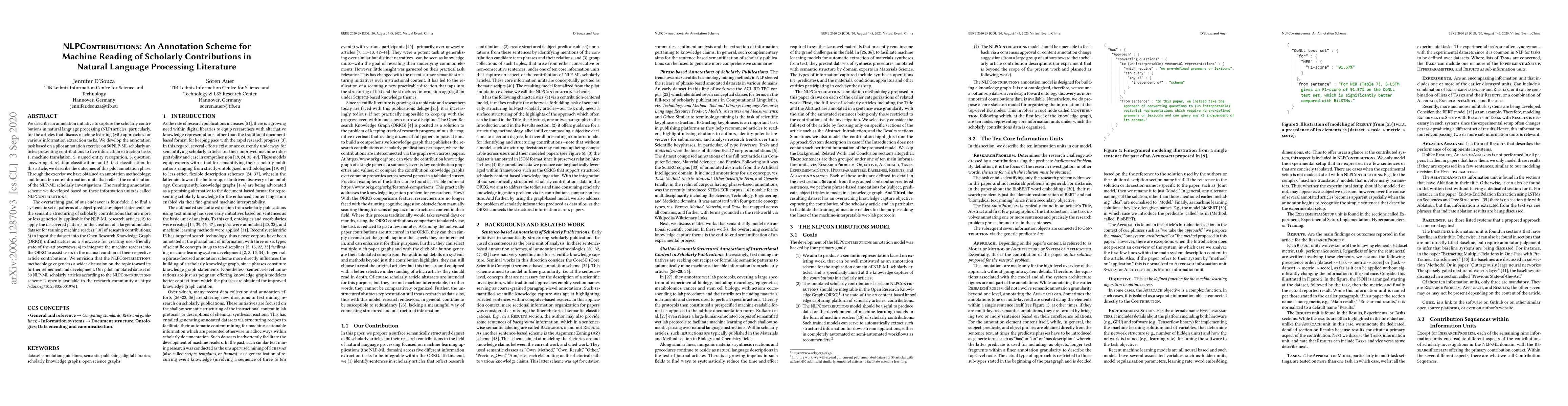 We describe an annotation initiative to capture the scholarly contributions in natural language processing (NLP) articles, particularly, for the articles that discuss machine learning (ML) approaches for various information extraction tasks. We develop the annotation task based on a pilot annotation exercise on 50 NLP-ML scholarly articles presenting contributions to five information extraction tasks 1. machine translation, 2. named entity recognition, 3. question answering, 4. relation classification, and 5. text classification. In this article, we describe the outcomes of this pilot annotation phase. Through the exercise we have obtained an annotation methodology; and found ten core information units that reflect the contribution of the NLP-ML scholarly investigations. The resulting annotation scheme we developed based on these information units is called NLPContributions. The overarching goal of our endeavor is four-fold: 1) to find a systematic set of patterns of subject-predicate-object statements for the semantic structuring of scholarly contributions that are more or less generically applicable for NLP-ML research articles; 2) to apply the discovered patterns in the creation of a larger annotated dataset for training machine readers of research contributions; 3) to ingest the dataset into the Open Research Knowledge Graph (ORKG) infrastructure as a showcase for creating user-friendly state-of-the-art overviews; 4) to integrate the machine readers into the ORKG to assist users in the manual curation of their respective article contributions. We envision that the NLPContributions methodology engenders a wider discussion on the topic toward its further refinement and development. Our pilot annotated dataset of 50 NLP-ML scholarly articles according to the NLPContributions scheme is openly available to the research community at https://doi.org/10.25835/0019761.