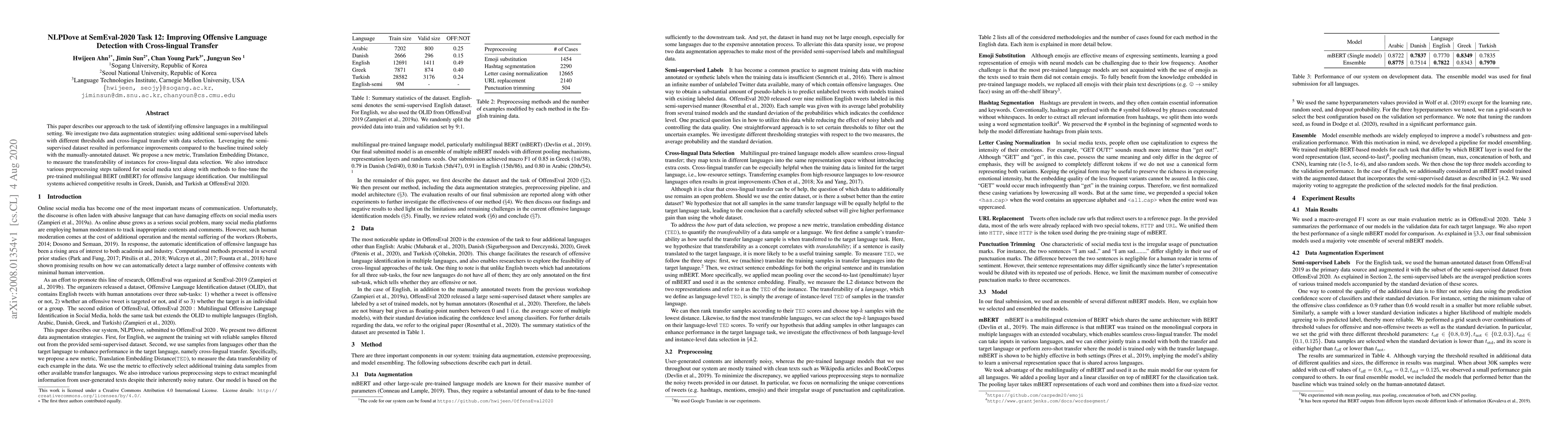 This paper describes our approach to the task of identifying offensive languages in a multilingual setting. We investigate two data augmentation strategies: using additional semi-supervised labels with different thresholds and cross-lingual transfer with data selection. Leveraging the semi-supervised dataset resulted in performance improvements compared to the baseline trained solely with the manually-annotated dataset. We propose a new metric, Translation Embedding Distance, to measure the transferability of instances for cross-lingual data selection. We also introduce various preprocessing steps tailored for social media text along with methods to fine-tune the pre-trained multilingual BERT (mBERT) for offensive language identification. Our multilingual systems achieved competitive results in Greek, Danish, and Turkish at OffensEval 2020.