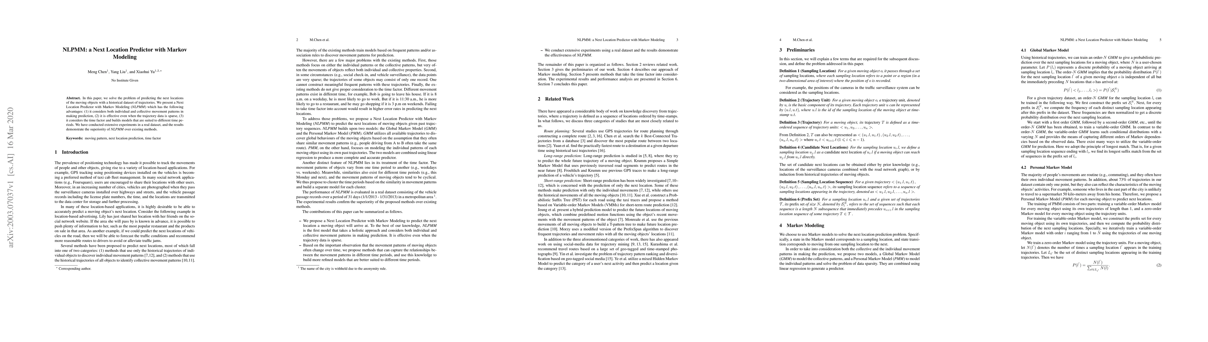 The paper introduces NLPMM, a Next Location Predictor with Markov Modeling that predicts future locations of moving objects using historical trajectory data. NLPMM effectively handles sparse data and considers both individual and collective movement patterns, outperforming existing methods in experiments.
