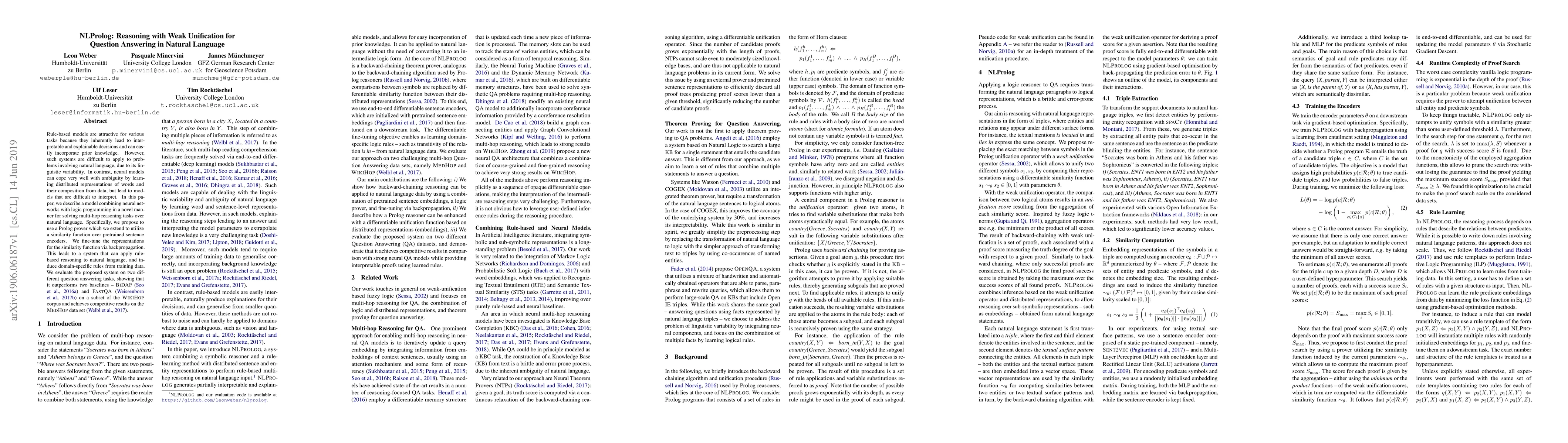 Rule-based models are attractive for various tasks because they inherently lead to interpretable and explainable decisions and can easily incorporate prior knowledge. However, such systems are difficult to apply to problems involving natural language, due to its linguistic variability. In contrast, neural models can cope very well with ambiguity by learning distributed representations of words and their composition from data, but lead to models that are difficult to interpret. In this paper, we describe a model combining neural networks with logic programming in a novel manner for solving multi-hop reasoning tasks over natural language. Specifically, we propose to use a Prolog prover which we extend to utilize a similarity function over pretrained sentence encoders. We fine-tune the representations for the similarity function via backpropagation. This leads to a system that can apply rule-based reasoning to natural language, and induce domain-specific rules from training data. We evaluate the proposed system on two different question answering tasks, showing that it outperforms two baselines -- BIDAF (Seo et al., 2016a) and FAST QA (Weissenborn et al., 2017b) on a subset of the WikiHop corpus and achieves competitive results on the MedHop data set (Welbl et al., 2017).