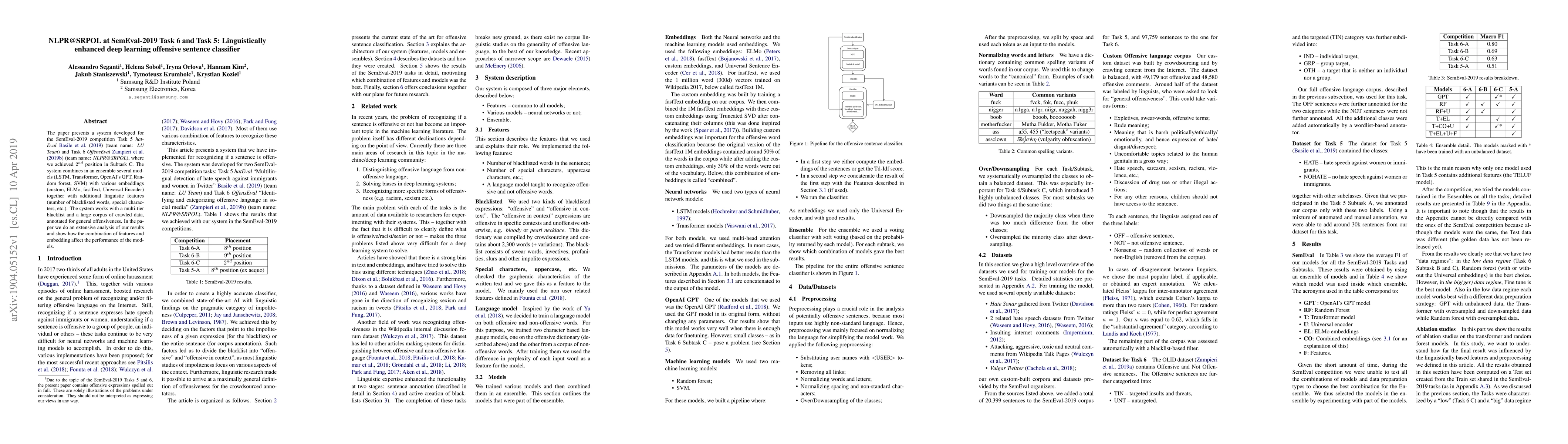 The NLPR@SRPOL team developed an ensemble of deep learning models and linguistic features for SemEval-2019's Task 5 and Task 6, achieving 2nd place in Subtask C. The system's performance is enhanced by combining various embeddings and linguistic features with an extensive analysis of their impact.