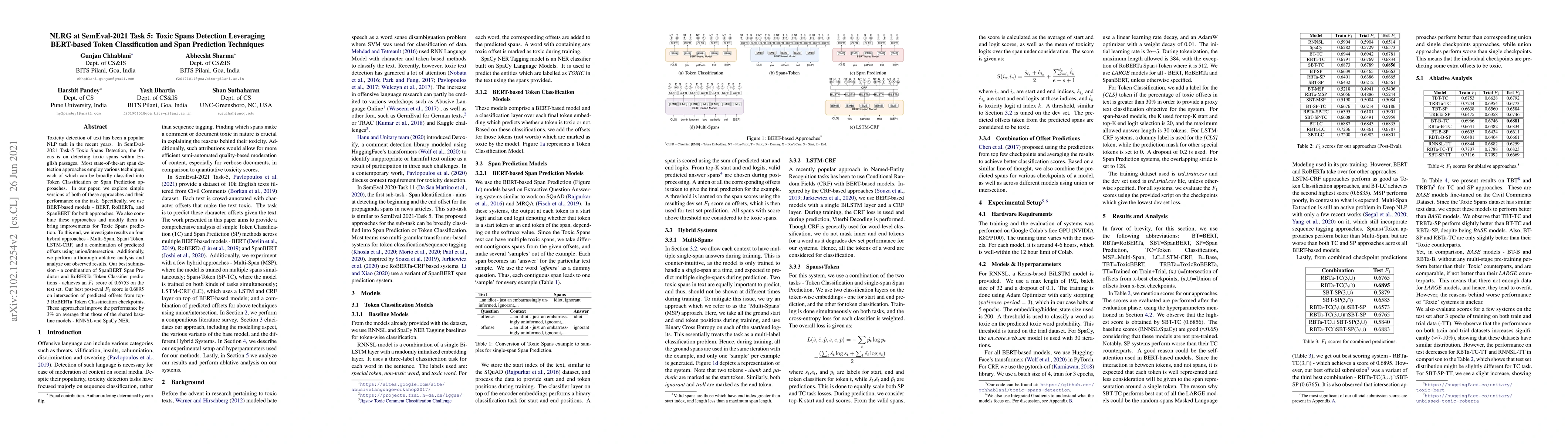 Toxicity detection of text has been a popular NLP task in the recent years. In SemEval-2021 Task-5 Toxic Spans Detection, the focus is on detecting toxic spans within passages. Most state-of-the-art span detection approaches employ various techniques, each of which can be broadly classified into Token Classification or Span Prediction approaches. In our paper, we explore simple versions of both of these approaches and their performance on the task. Specifically, we use BERT-based models -- BERT, RoBERTa, and SpanBERT for both approaches. We also combine these approaches and modify them to bring improvements for Toxic Spans prediction. To this end, we investigate results on four hybrid approaches -- Multi-Span, Span+Token, LSTM-CRF, and a combination of predicted offsets using union/intersection. Additionally, we perform a thorough ablative analysis and analyze our observed results. Our best submission -- a combination of SpanBERT Span Predictor and RoBERTa Token Classifier predictions -- achieves an F1 score of 0.6753 on the test set. Our best post-eval F1 score is 0.6895 on intersection of predicted offsets from top-3 RoBERTa Token Classification checkpoints. These approaches improve the performance by 3% on average than those of the shared baseline models -- RNNSL and SpaCy NER.