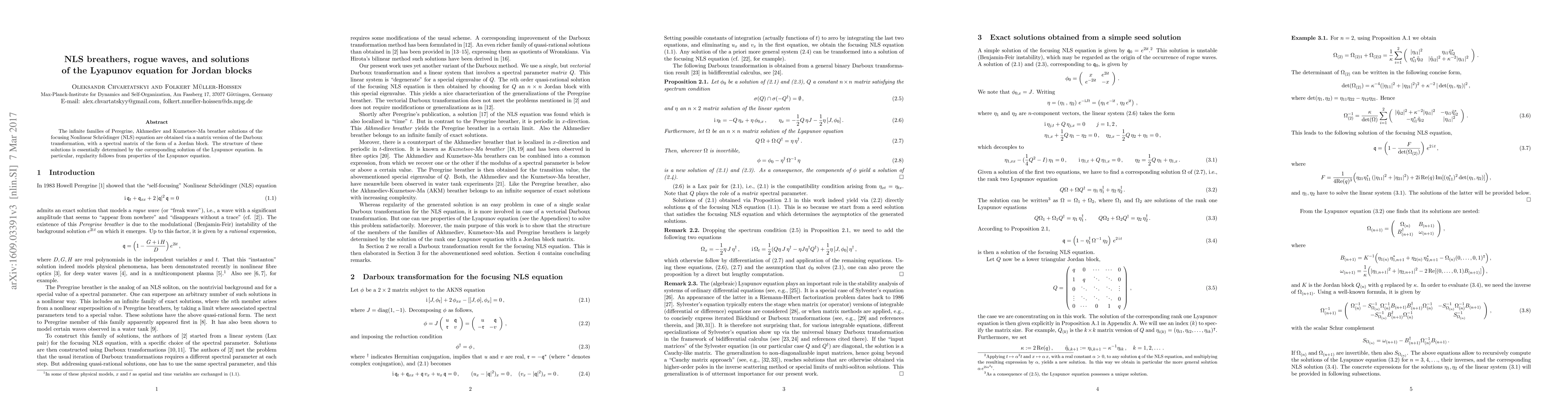 The paper presents infinite families of breather solutions for the NLS equation using a matrix Darboux transformation with Jordan block spectral matrices. The solutions' structure is tied to the Lyapunov equation, with regularity stemming from its properties.