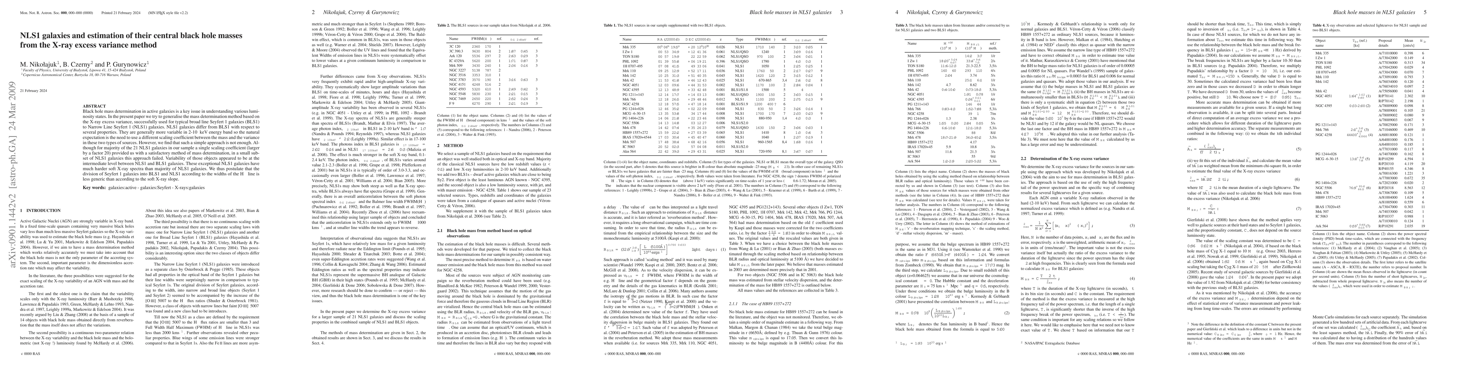 The paper extends the X-ray excess variance method for estimating central black hole masses from broad line Seyfert 1 (BLS1) galaxies to Narrow Line Seyfert 1 (NLS1) galaxies. While a single scaling coefficient larger by a factor of 20 generally worked for most NLS1 galaxies, a subset of these galaxies required intermediate scaling, suggesting that X-ray spectral slope, rather than broad line width, better distinguishes BLS1 and NLS1 galaxies.