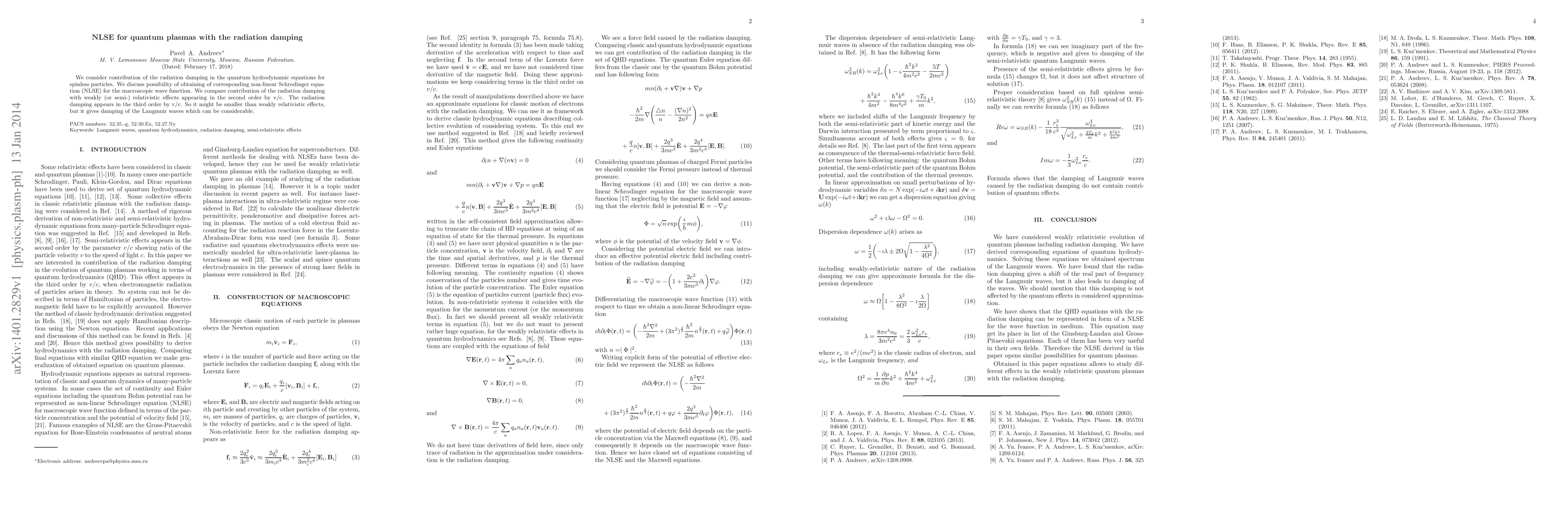 We consider contribution of the radiation damping in the quantum hydrodynamic equations for spinless particles. We discuss possibility of obtaining of corresponding non-linear Schrodinger equation (NLSE) for the macroscopic wave function. We compare contribution of the radiation damping with weakly (or semi-) relativistic effects appearing in the second order by v/c. The radiation damping appears in the third order by v/c. So it might be smaller than weakly relativistic effects, but it gives damping of the Langmuir waves which can be considerable.