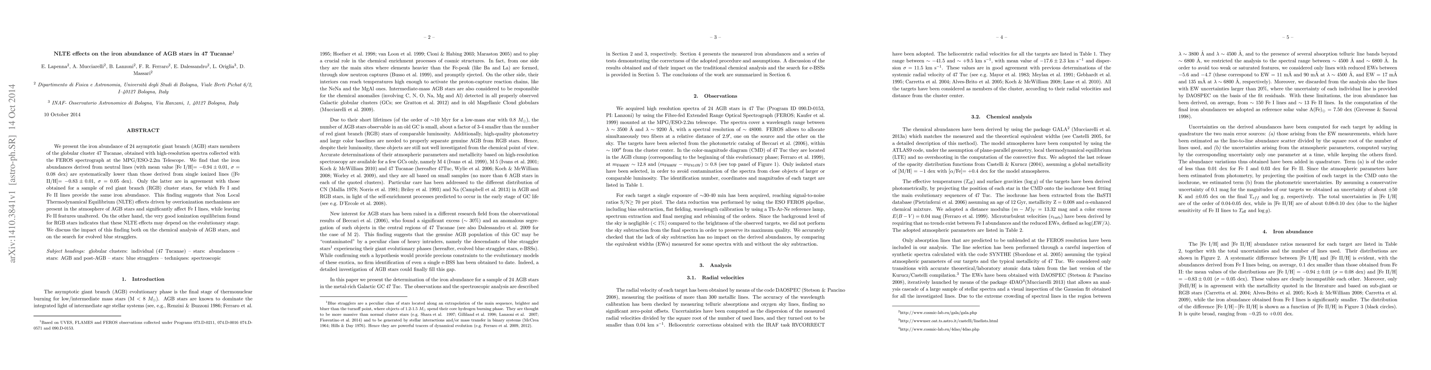 We present the iron abundance of 24 asymptotic giant branch (AGB) stars members of the globular cluster 47 Tucanae, obtained with high-resolution spectra collected with the FEROS spectrograph at the MPG/ESO-2.2m Telescope. We find that the iron abundances derived from neutral lines (with mean value [Fe I/H] = -0.94 +/- 0.01, {\sigma} = 0.08 dex) are systematically lower than those derived from single ionized lines ([Fe II/H] = -0.83 +/- 0.01, {\sigma} = 0.05 dex). Only the latter are in agreement with those obtained for a sample of red giant branch (RGB) cluster stars, for which Fe I and Fe II lines provide the same iron abundance. This finding suggests that Non Local Thermodynamical Equilibrium (NLTE) effects driven by overionization mechanisms are present in the atmosphere of AGB stars and significantly affect Fe I lines, while leaving Fe II features unaltered. On the other hand, the very good ionization equilibrium found for RGB stars indicates that these NLTE effects may depend on the evolutionary stage. We discuss the impact of this finding both on the chemical analysis of AGB stars, and on the search for evolved blue stragglers.
