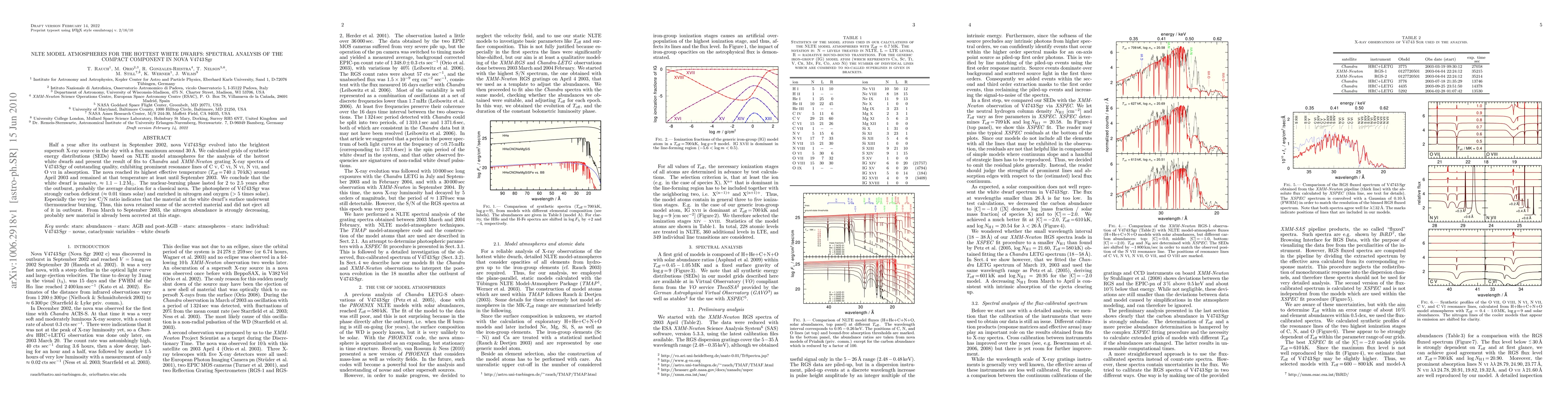 This paper analyzes the spectral characteristics of nova V4743 Sgr using NLTE model atmospheres, revealing a massive white dwarf with a temperature of 740 +/- 70kK and significant thermonuclear burning, resulting in a carbon-deficient, nitrogen- and oxygen-enriched photosphere. The nova retained some accreted material and showed decreasing nitrogen abundance from March to September 2003, indicating ongoing accretion.