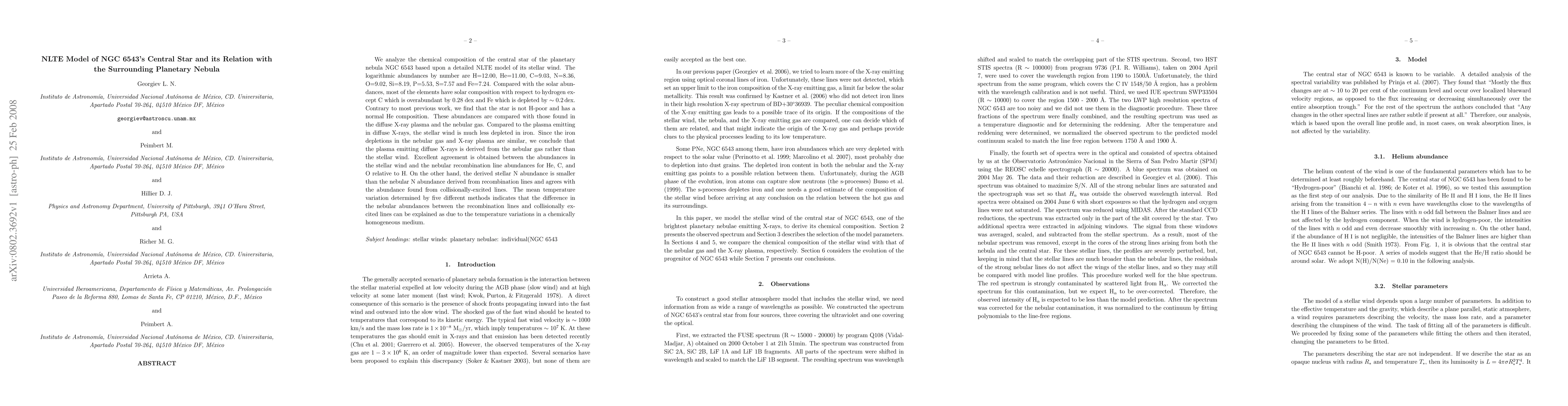 We analyze the chemical composition of the central star of the planetary nebula NGC 6543 based upon a detailed NLTE model of its stellar wind. The logarithmic abundances by number are H=12.00, He=11.00, C=9.03, N=8.36, O=9.02, Si=8.19, P=5.53, S=7.57 and Fe=7.24. Compared with the solar abundances, most of the elements have solar composition with respect to hydrogen except C which is overabundant by 0.28 dex and Fe which is depleted by $\sim 0.2$ dex. Contrary to most previous work, we find that the star is not H-poor and has a normal He composition. These abundances are compared with those found in the diffuse X-ray plasma and the nebular gas. Compared to the plasma emitting in diffuse X-rays, the stellar wind is much less depleted in iron. Since the iron depletions in the nebular gas and X-ray plasma are similar, we conclude that the plasma emitting diffuse X-rays is derived from the nebular gas rather than the stellar wind. Excellent agreement is obtained between the abundances in the stellar wind and the nebular recombination line abundances for He, C, and O relative to H. On the other hand, the derived stellar N abundance is smaller than the nebular N abundance derived from recombination lines and agrees with the abundance found from collisionally-excited lines. The mean temperature variation determined by five different methods indicates that the difference in the nebular abundances between the recombination lines and collisionally excited lines can be explained as due to the temperature variations in a chemically homogeneous medium.