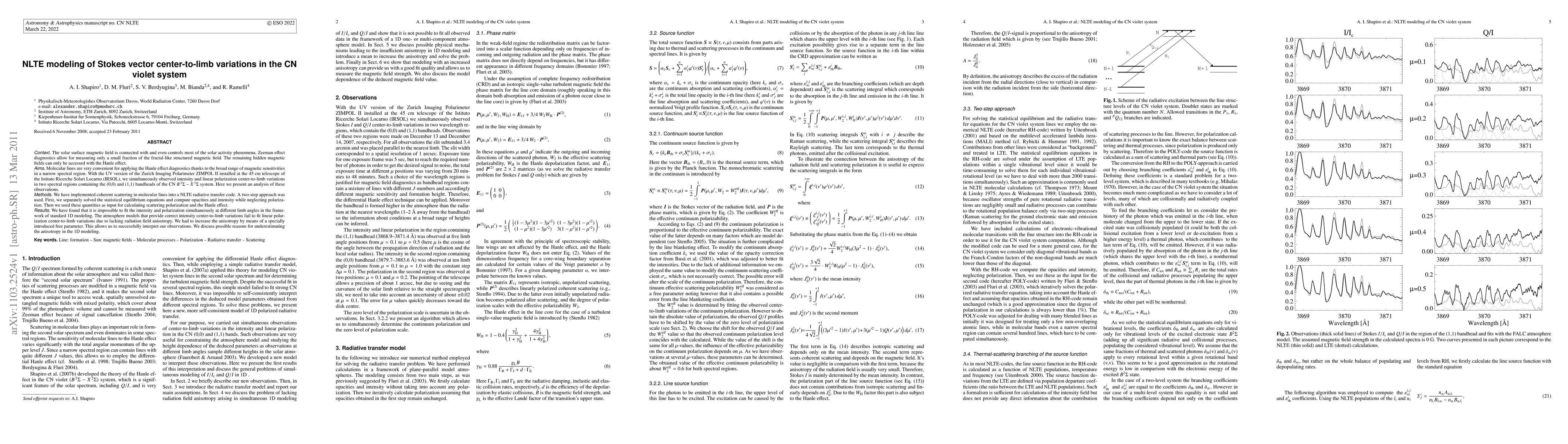 This paper investigates the center-to-limb variations of the CN violet system's Stokes vector using NLTE modeling, revealing discrepancies between observed intensity and polarization. The study finds that standard 1D models fail to account for the required anisotropy in the radiation field, necessitating an additional parameter to reconcile observations.