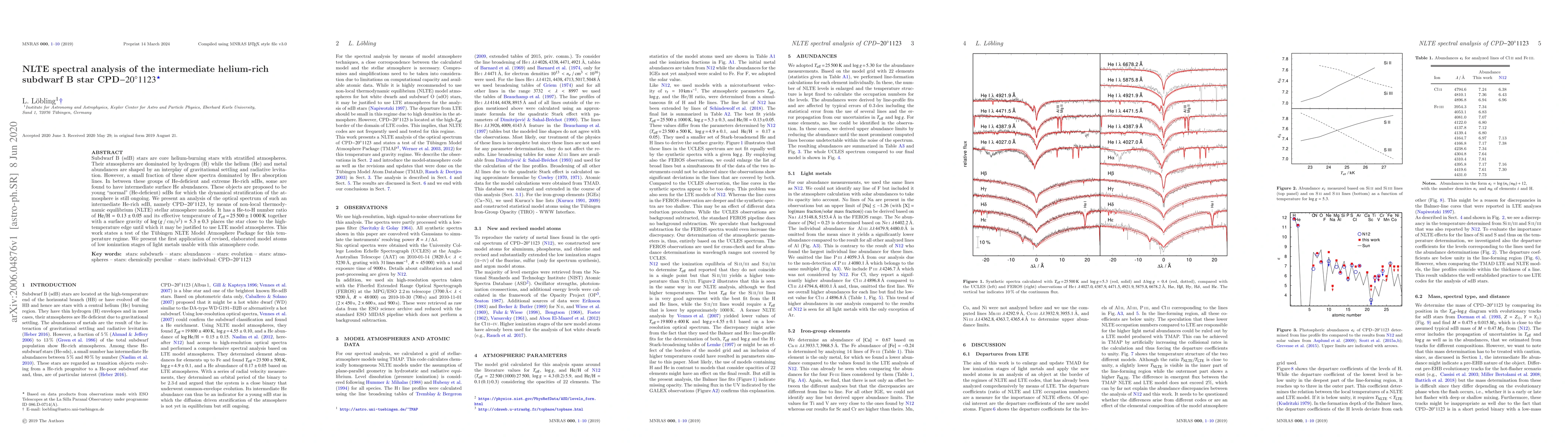Subdwarf B (sdB) stars are core helium-burning stars with stratified atmospheres. Their atmospheres are dominated by hydrogen (H) while the helium (He) and metal abundances are shaped by an interplay of gravitational settling and radiative levitation. However, a small fraction of these show spectra dominated by He I absorption lines. In between these groups of He-deficient and extreme He-rich sdBs, some are found to have intermediate surface He abundances. These objects are proposed to be young "normal" (He-deficient) sdBs for which the dynamical stratification of the atmosphere is still ongoing. We present an analysis of the optical spectrum of such an intermediate He-rich sdB, namely CPD-20{\deg}1123, by means of non-local thermodynamic equilibrium (NLTE) stellar atmosphere models. It has a He-to-H number ratio of $\mathrm{He/H} = 0.13 \pm 0.05$ and its effective temperature of $T_\mathrm{eff} = 25\,500 \pm 1\,000$ together with a surface gravity of $\log\,(g\,/\,\mathrm{cm}/\mathrm{s}^2) = 5.3 \pm 0.3$ places the star close to the high-temperature edge until which it may be justified to use LTE model atmospheres. This work states a test of the T\"ubingen NLTE Model Atmosphere Package for this temperature regime. We present the first application of revised, elaborated model atoms of low ionization stages of light metals usable with this atmosphere code.